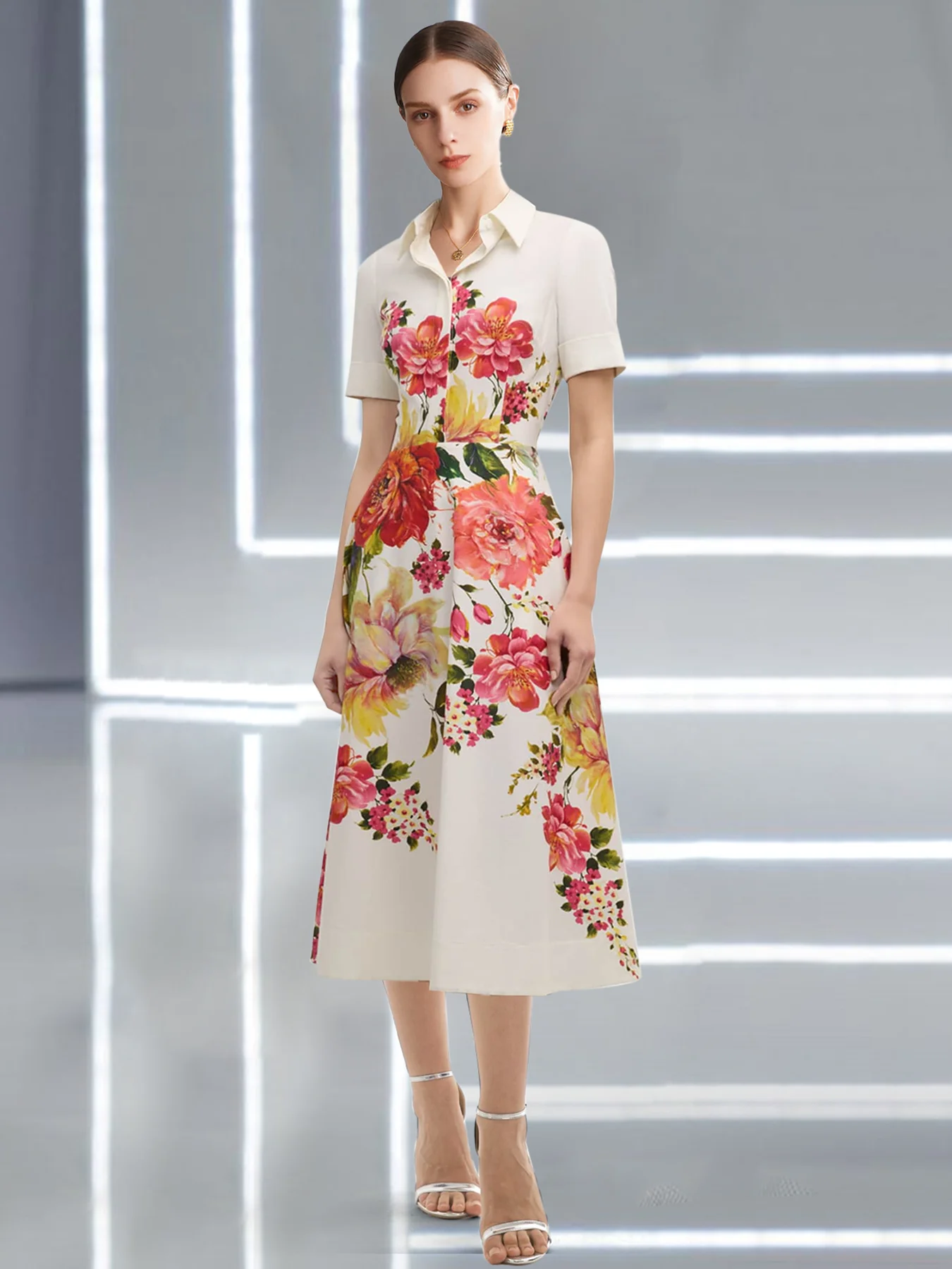 Elegant Casual Women’s Shirt Dress Ladies Fashion Flower Print Holiday A-line Dress Summer Short Sleeve Knee Length Dress