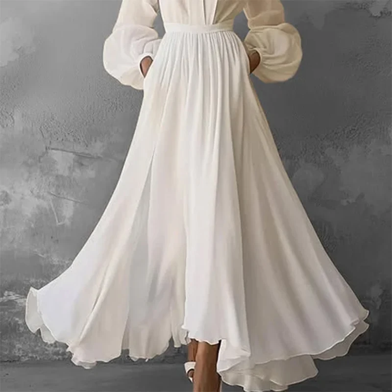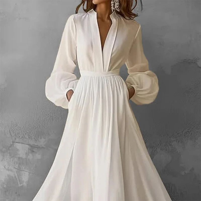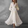 Elegant Deep V Neck Lantern Sleeve Tunic Maxi Dress for Women High Waist Pleated Evening Party Dresses White Dress Vestidos