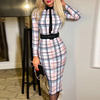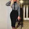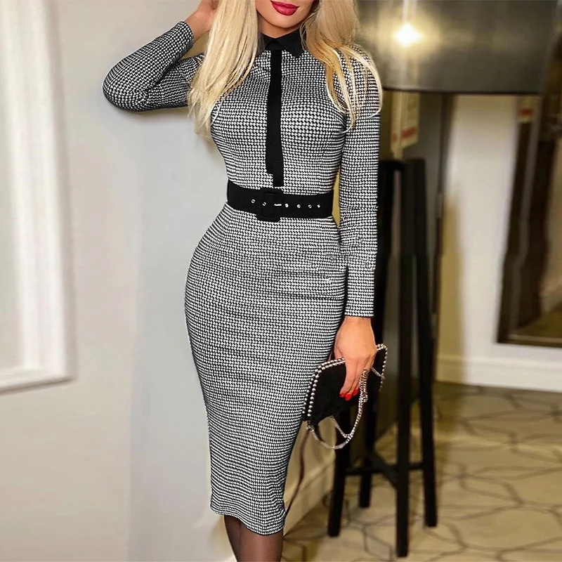 Elegant Houndstooth Floral Print Bodycon Dress Fashion Slim Women Lapel Dress Lady Autumn Winter Office Commute Belt Party Dress