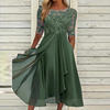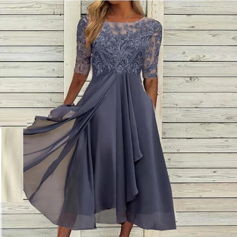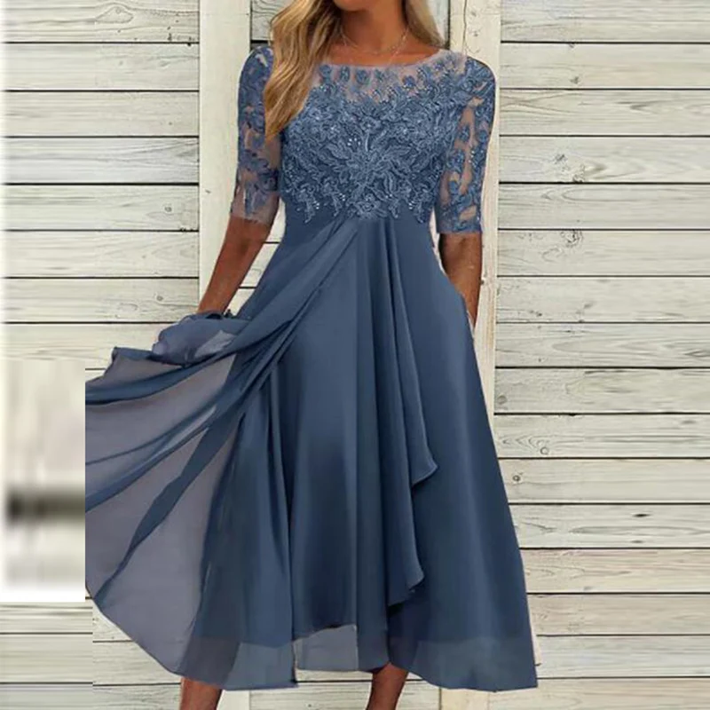Elegant Lace Hollow Out Midi Dress Women Summer Fashion O Neck Short Sleeve Patchwork Party Dress Office Lady Irregular Vestidos