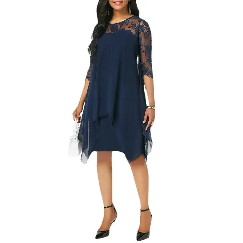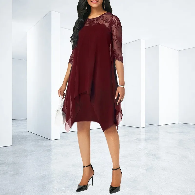 Elegant Ladies Loose Dress 2021 New O-neck Short Sleeve Lace Lrregular Lady Party Dresses Vintage Solid Color Female Mini Dress