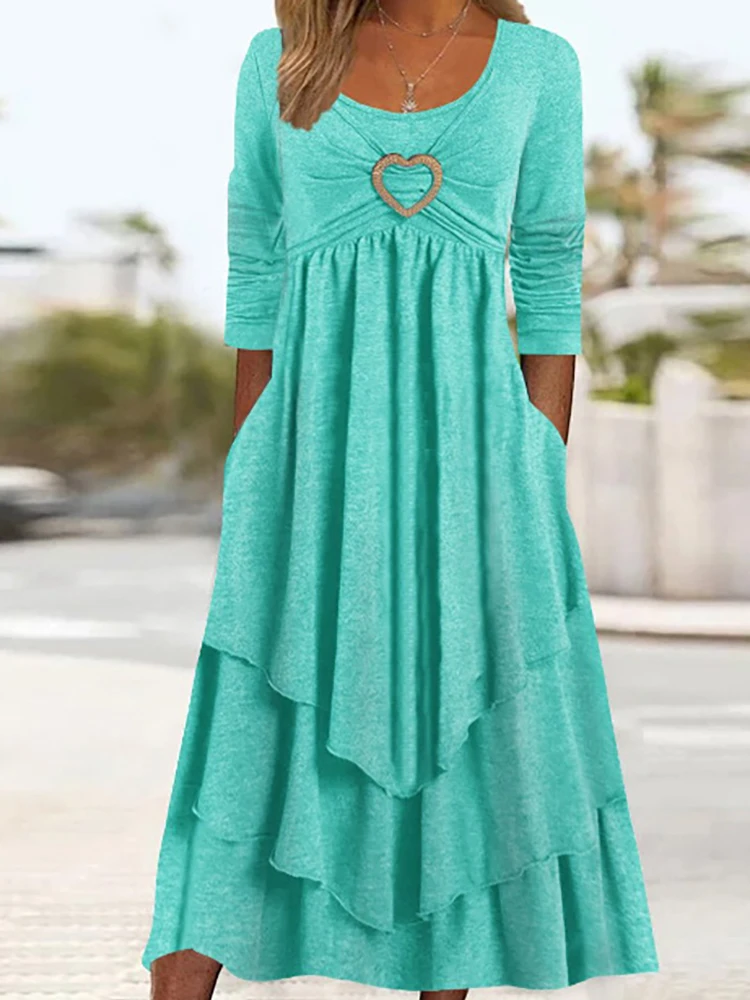 Elegant Office Women Patchwork Pockets Midi Dress Round Neck Basic Solid Long Sleeve Dress Lady Casual Summer Ruffles Club Dress