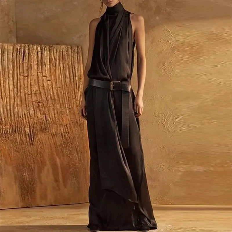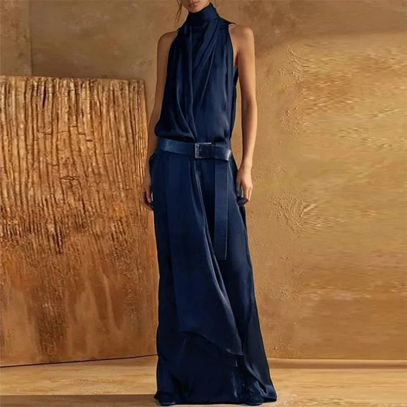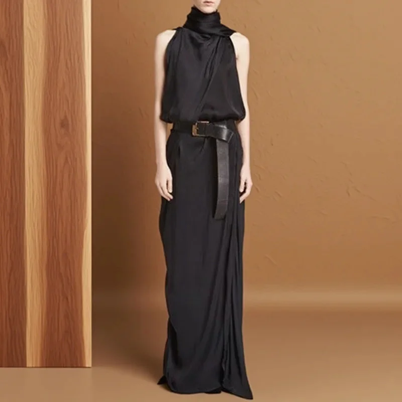 Elegant Slim Fit Sashes Waist Irregular Vacation Dress Chic Solid Folds Office Lady Dress Summer Turtleneck A-Line Party Dresses