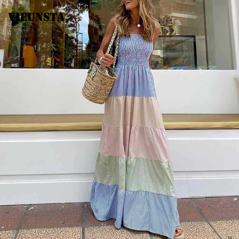 Elegant Striped Print Sleeveless Dress Women Fashion Strap Long Dresses Summer Female Casual Beach Sundress Femme Party Vestidos