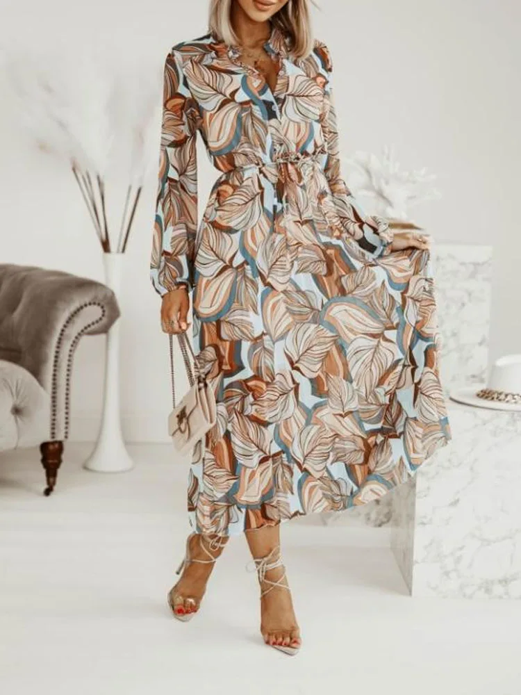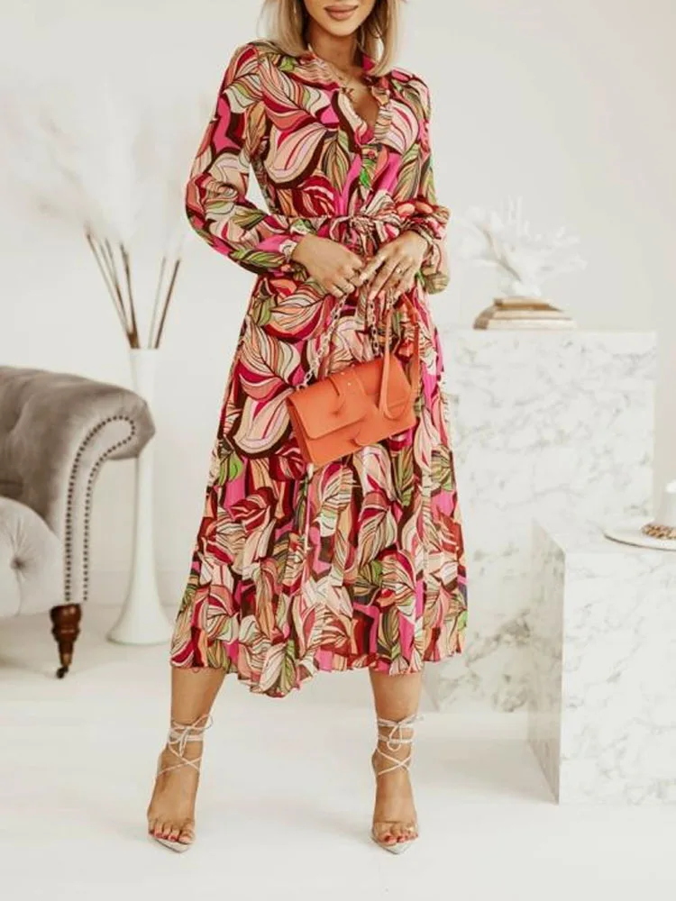 Elegant Summer Office Lady Long Sleeve Pleated Shirt Dress 2022 Fashion Tie-up Waist Button Design Party Dresses Women Vestidos