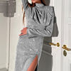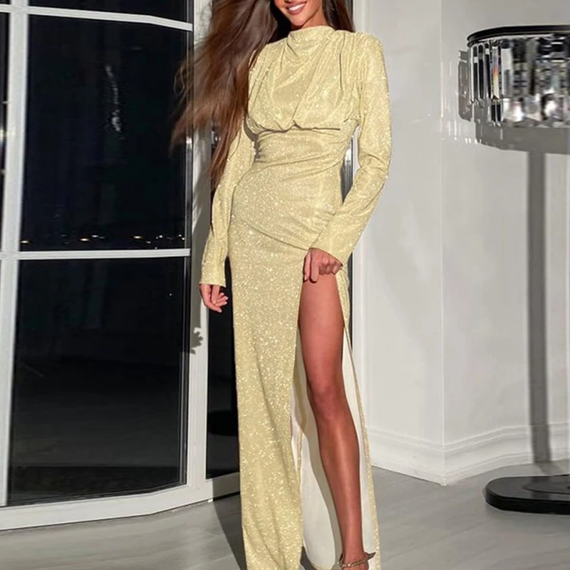 Elegant Turtleneck Bright Silk High Split Robe Dress Women Long Sleeve Waist Party Sexy Dress Autumn Fashion Solid Sheath Dress