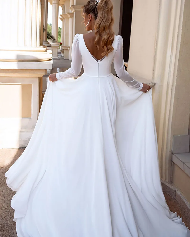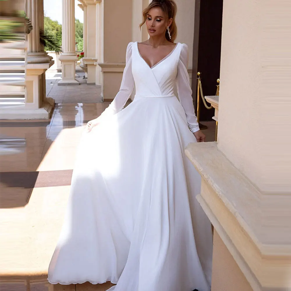 Elegant V-Neck Chiffon Wedding Dress Long Sleeves Simple Wedding Gowns 2021 Backless Bridal Gown For Women Robe De Mariee