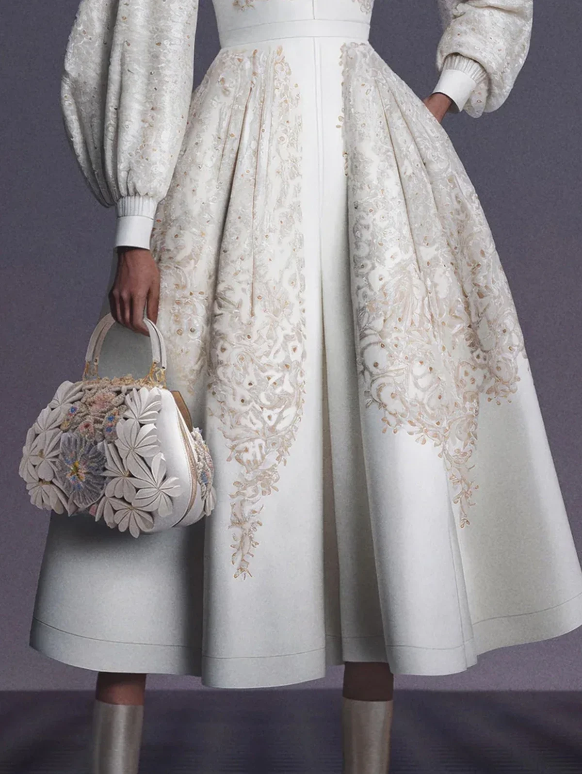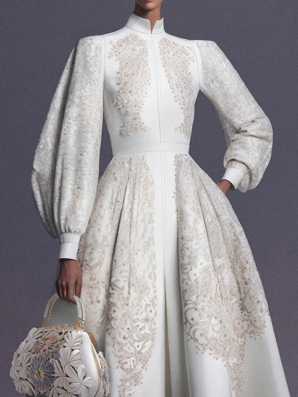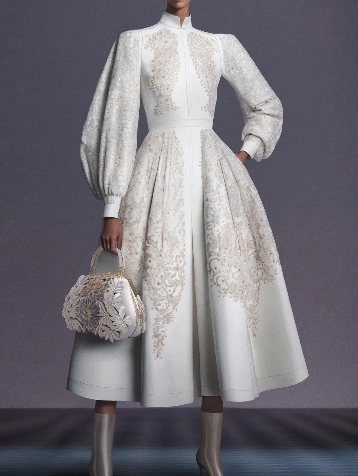 Elegant Women A-Line Mid-Length Dress Vintage Floral Pattern Print Fashionable Stand Collar Lantern Sleeves Evening Party Dress