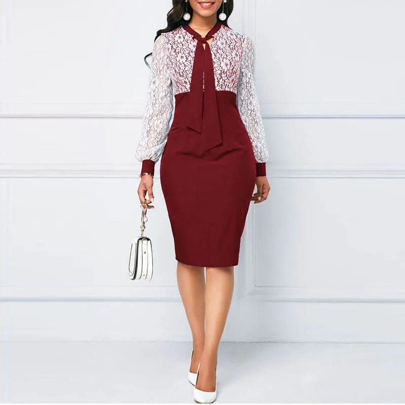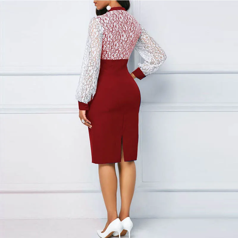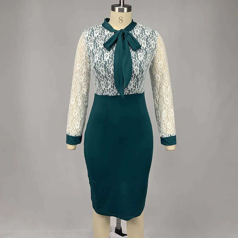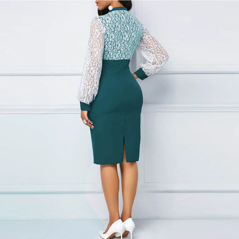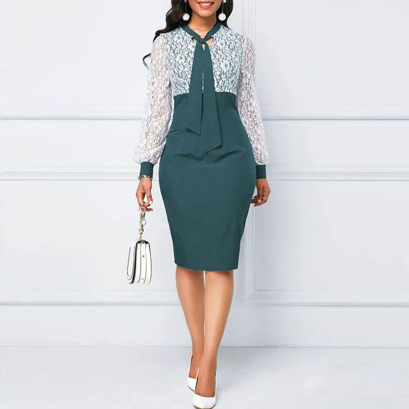 Elegant Women Dress 2021 Autumn Fashion Lace Patchwork Long-sleeved Office Ladies Dresses Vintage Casual Slim Dress Vestido