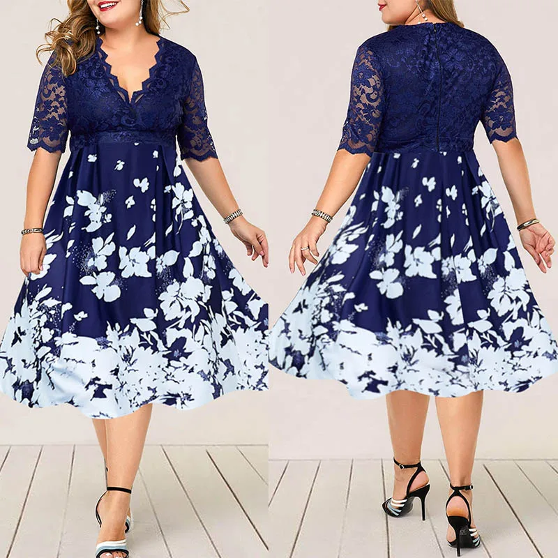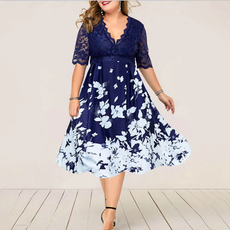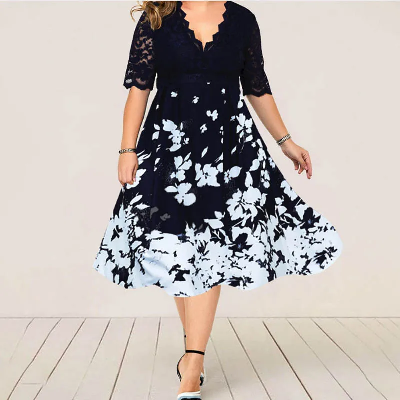 Elegant Women Dress 2021 Summer Fashion V Neck Lace Short Sleeve Loose Dress Vintage Floral Printed Casual Ladies Dress Vestido