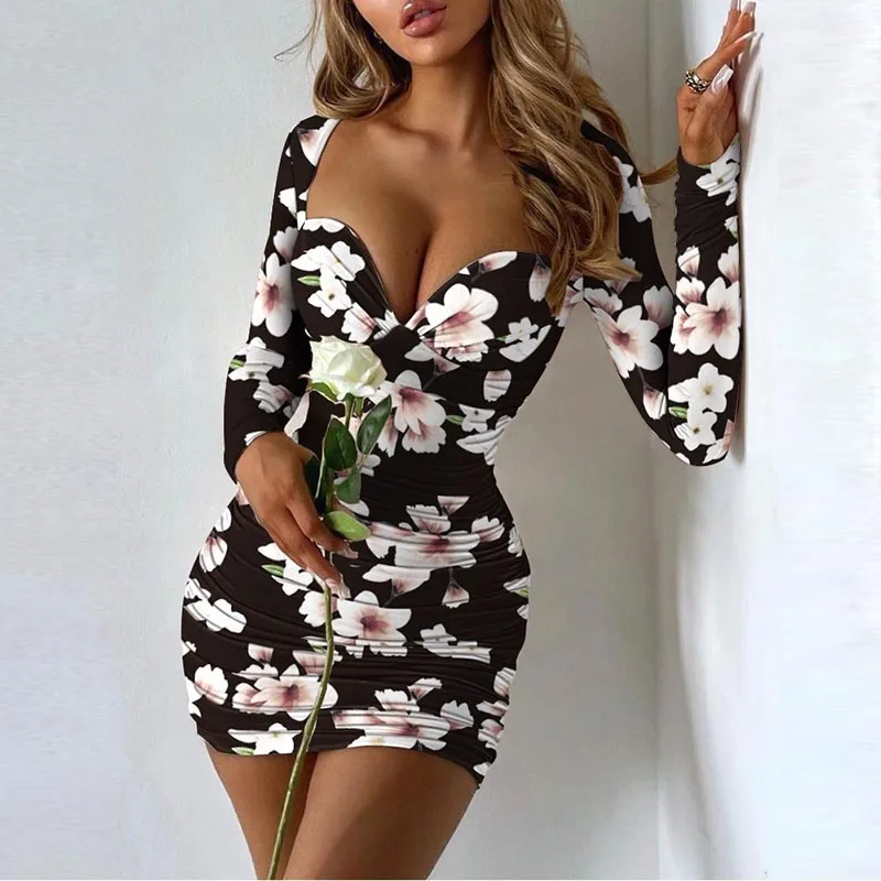 Elegant Women Dress Autumn Fashion Square Collar Long-sleeved Sexy Slim Party Dresses Vintage Printed Casual Ladies Mini Dress