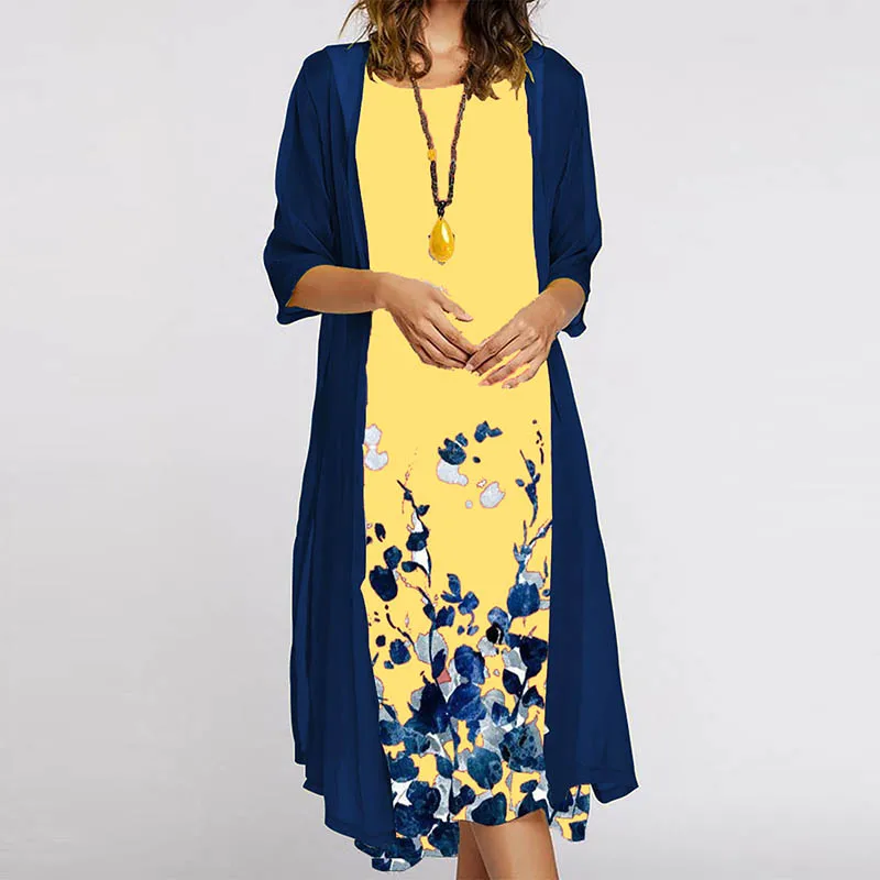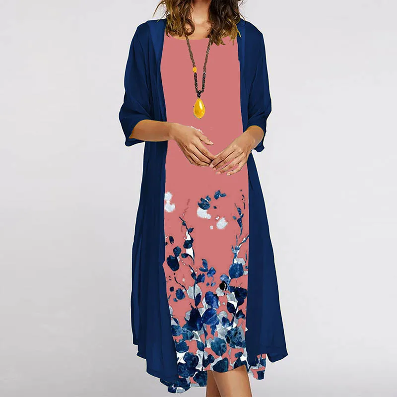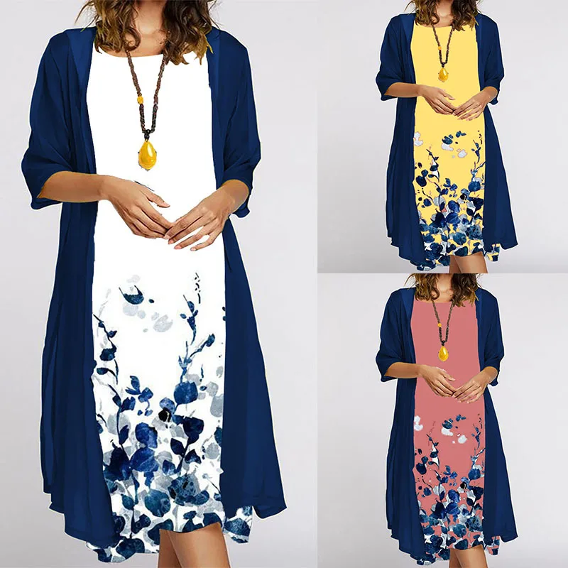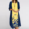 Elegant Women Dress Autumn O-neck Printed Loose Dress + Cardigan Blouse Vintage Casual Ladies Two Piece Set Ladies Party Dresses