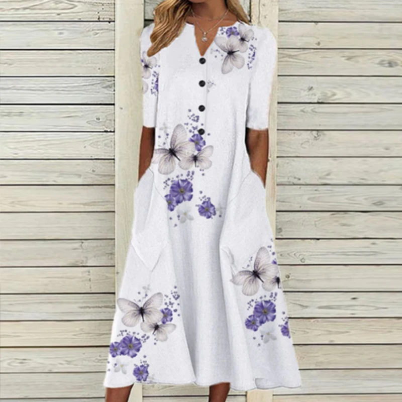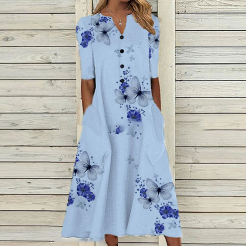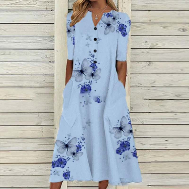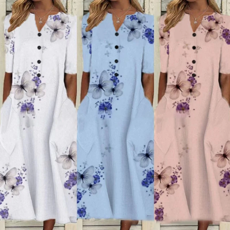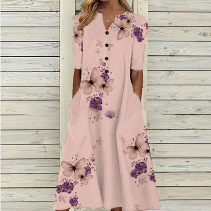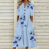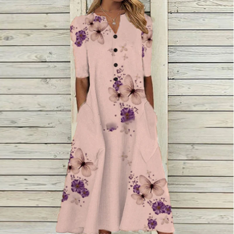 Elegant Women Dress New Fashion Summer V-neck Short Sleeved Maxi Dresses Vintage Floral Printed Casual Lady Loose Dress Vestido