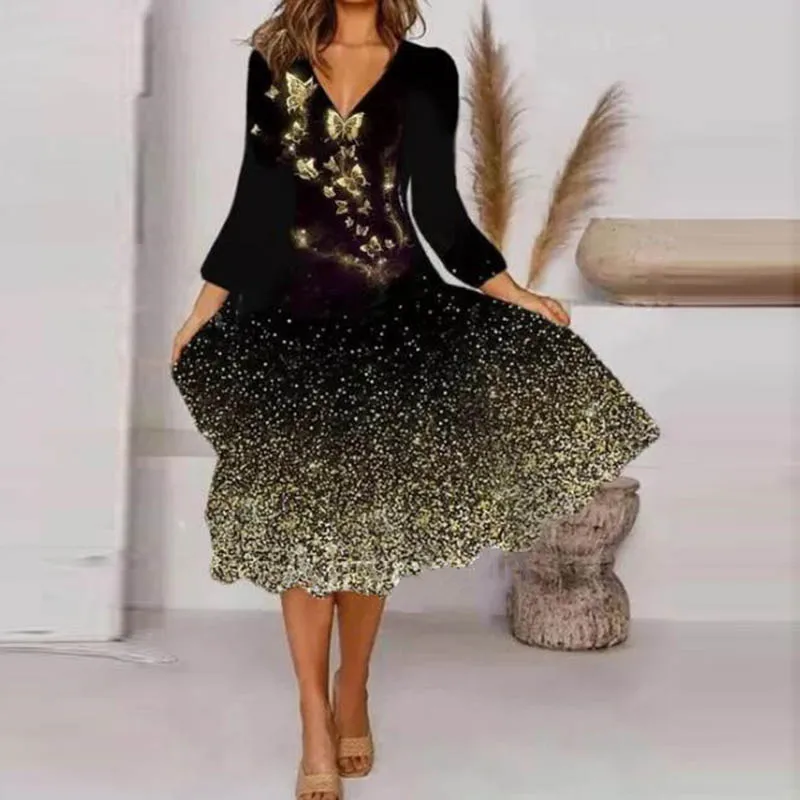 Elegant Women Dress Spring Fashion V Neck Long-sleeved A-Line Ladies Party Dresses Vintage Printed Casual Female Loose Dress