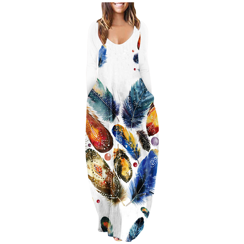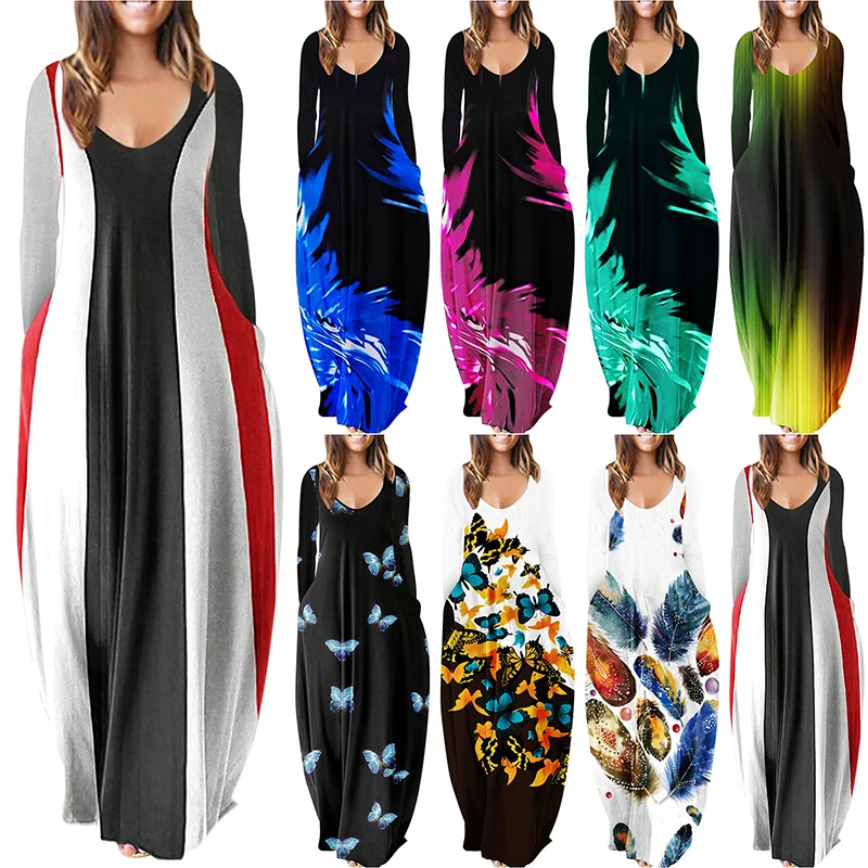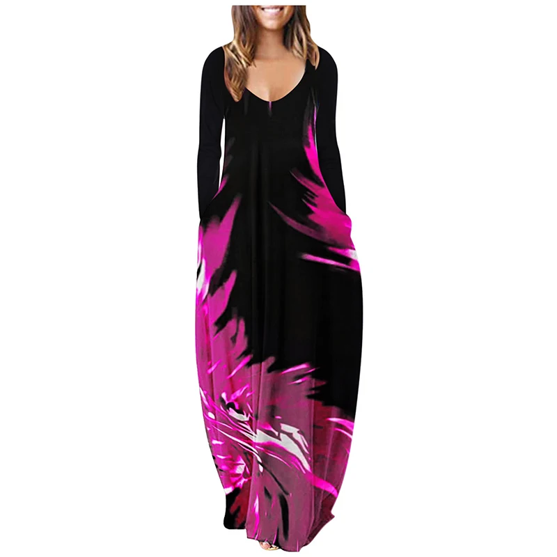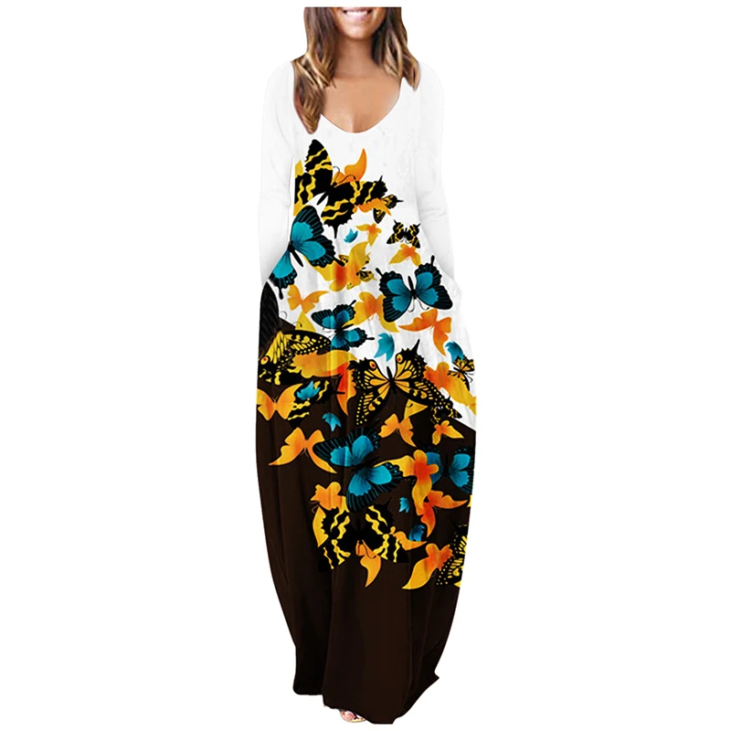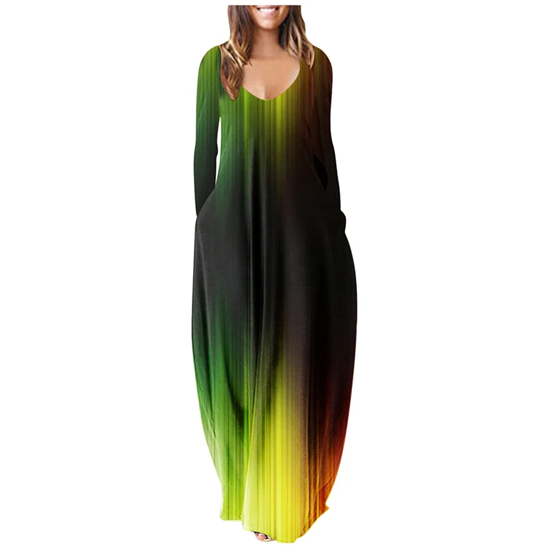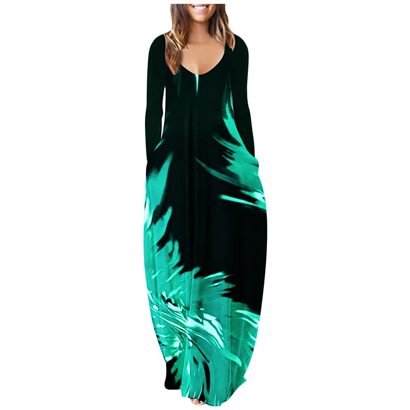 Elegant Women Loose Dress 2021 Fashion Casual V Neck Long-Sleeve Ladies Maxi Dress Vintage Printed Female Party Dresses Vestido