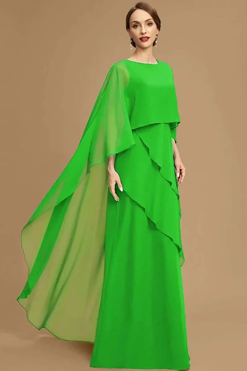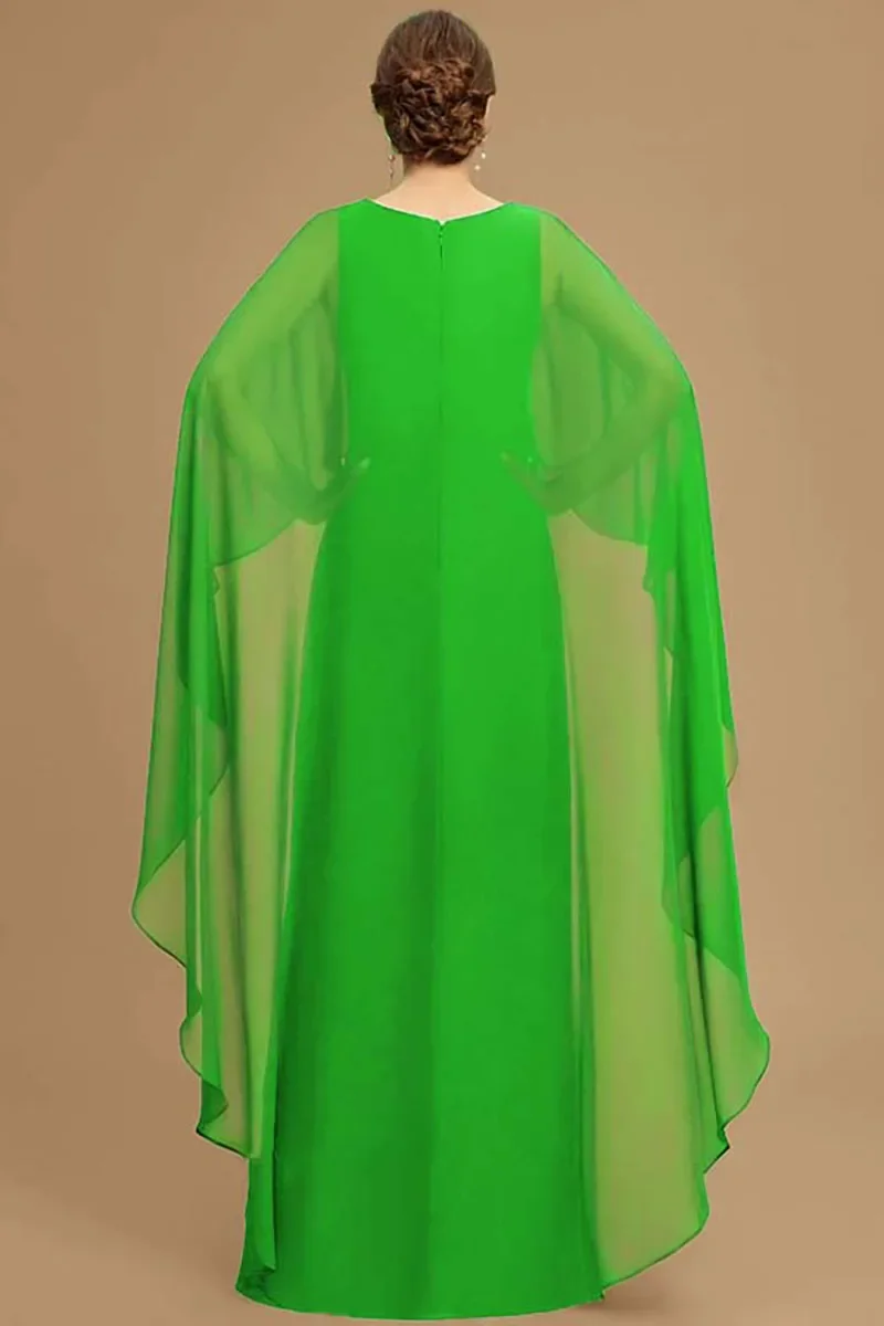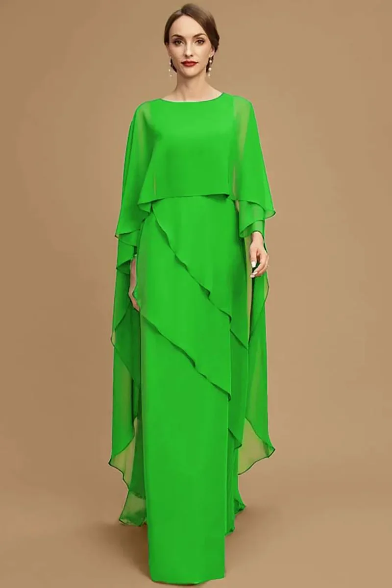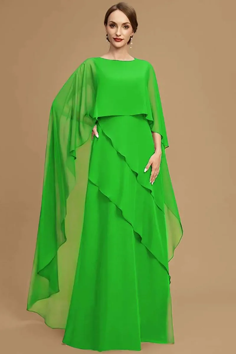 Elegant Women Party Dress Chiffon Batwing Cape Sleeve Tiered Asymmetric Trim O-Neck Gowns Cocktail Wedding Guest Long Dress