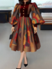 Elegant Women’s Dress Ethnic Print Stand Collar Button Lantern Sleeve Velvet Midi Dress Evening Party Dress Women’s Midi Dress
