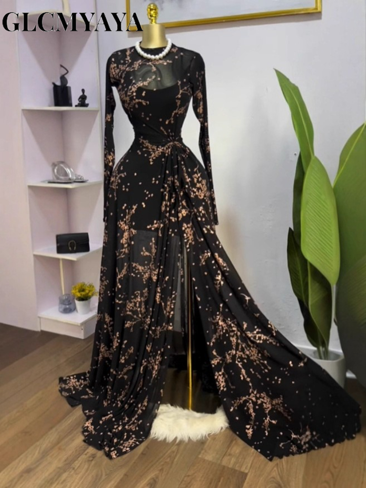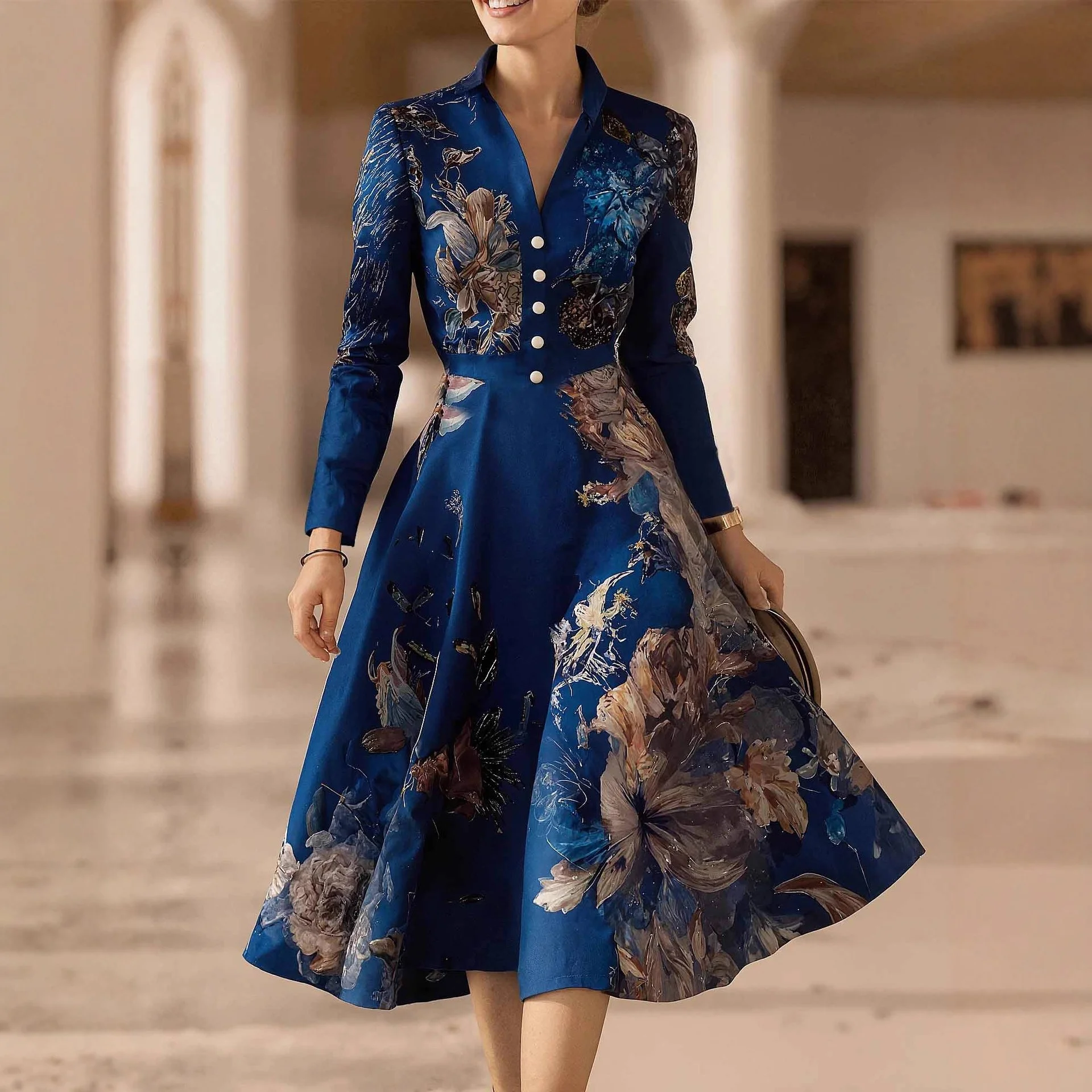 Elegant Women’s Dresses Floral Print Turndown Collar Long Sleeve Mid-Length Waisted Evening Party Dress Button Women Midi Dress
