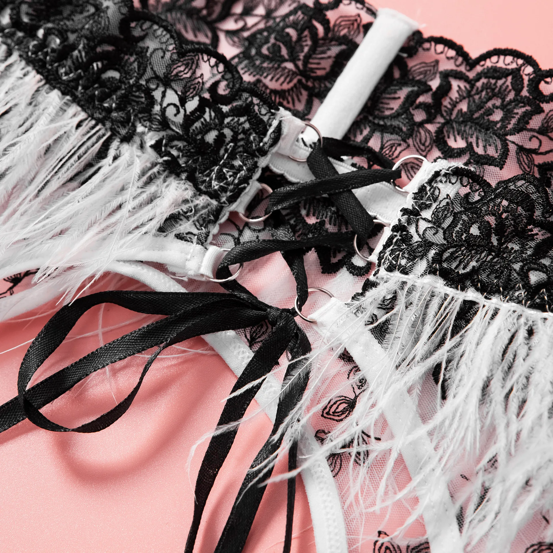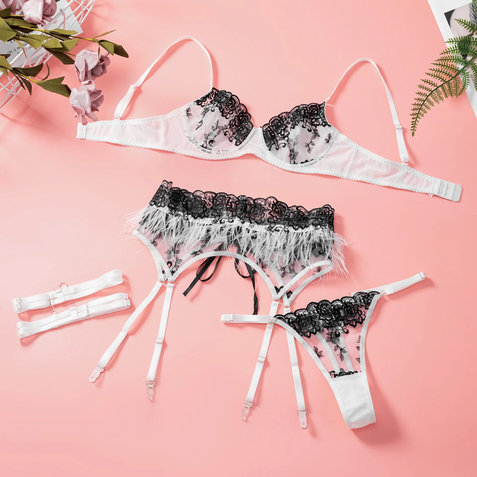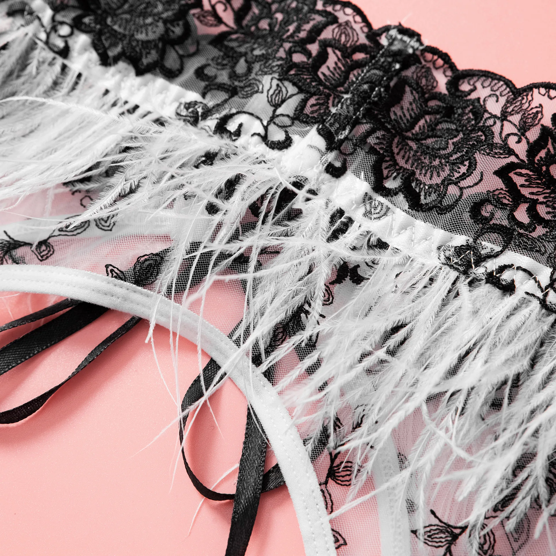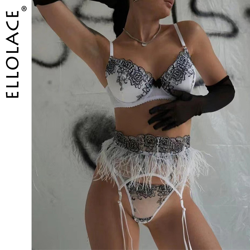 Ellolace Fancy Lingerie For Women Luxury Feather Lace Up Garter 5-Piece Floral Embroidery Fine Intimate Uncensored Erotic Set