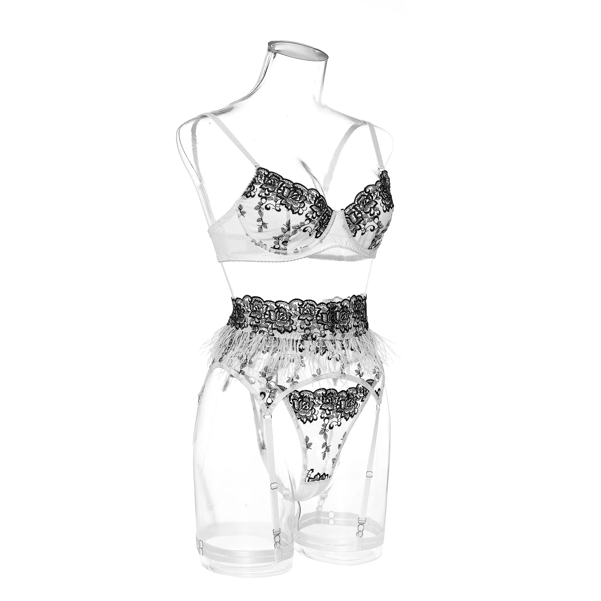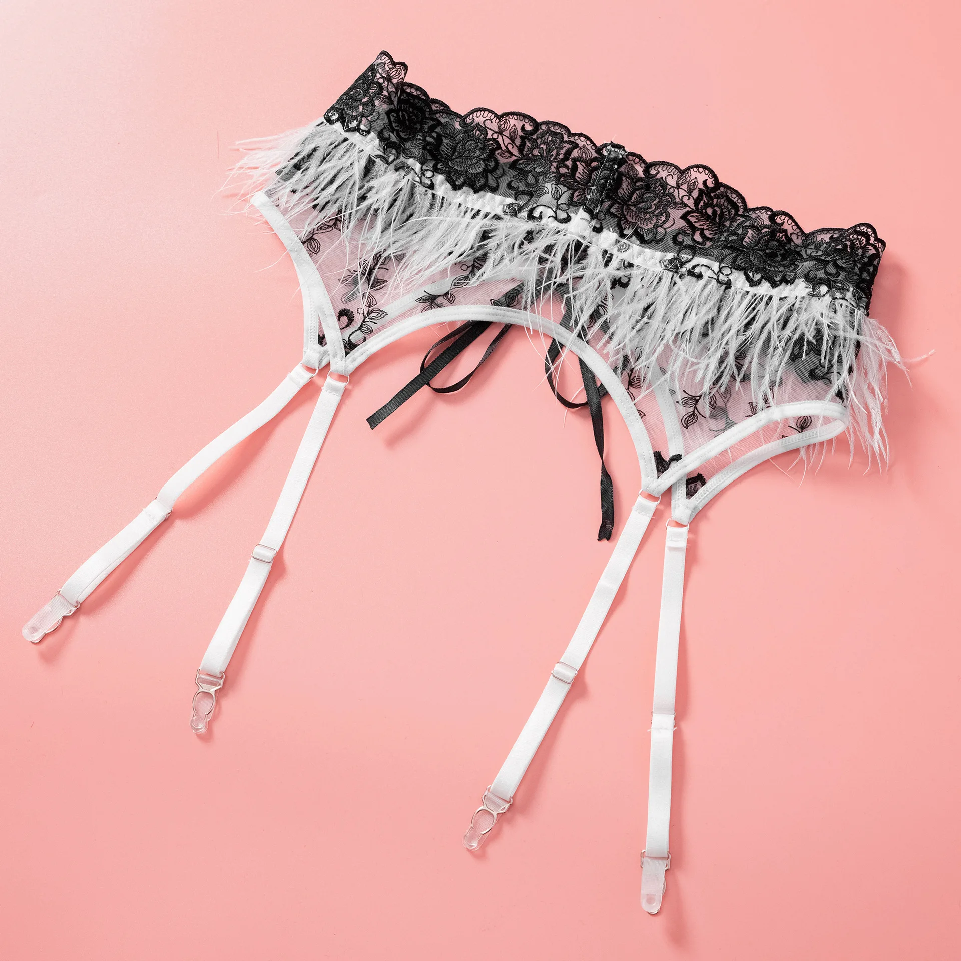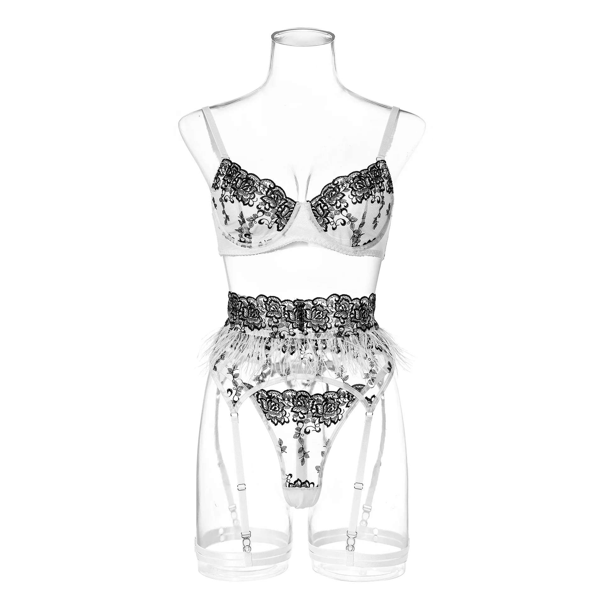 Ellolace Fancy Lingerie For Women Luxury Feather Lace Up Garter 5-Piece Floral Embroidery Fine Intimate Uncensored Erotic Set