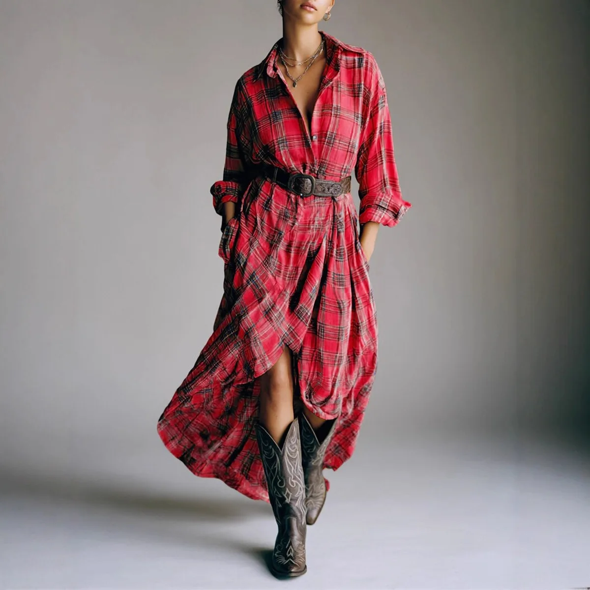 European American Retro Long-sleeved Plaid Shirt Dress 2025 Spring Autumn New Fashionable Loose Casual Versatile Dress With Belt