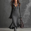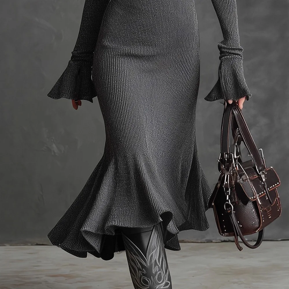 European American Trumpet Dresses Women Solid Autumn Winter Zipper Lapel Flared Sleeve Knitted Fishtail Dress Slim Fit Vestidos
