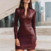 European And American Style Fashionable PU Leather Solid Color Long Sleeve Sexy Deep V Slim Fit Back Zip Hip Dress Streetwear