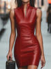 European And American Style Fashionable PU Leather Solid Color Sleeveless Stand Collar Deep V Slim Fit Back Zip Hip Dress 2025