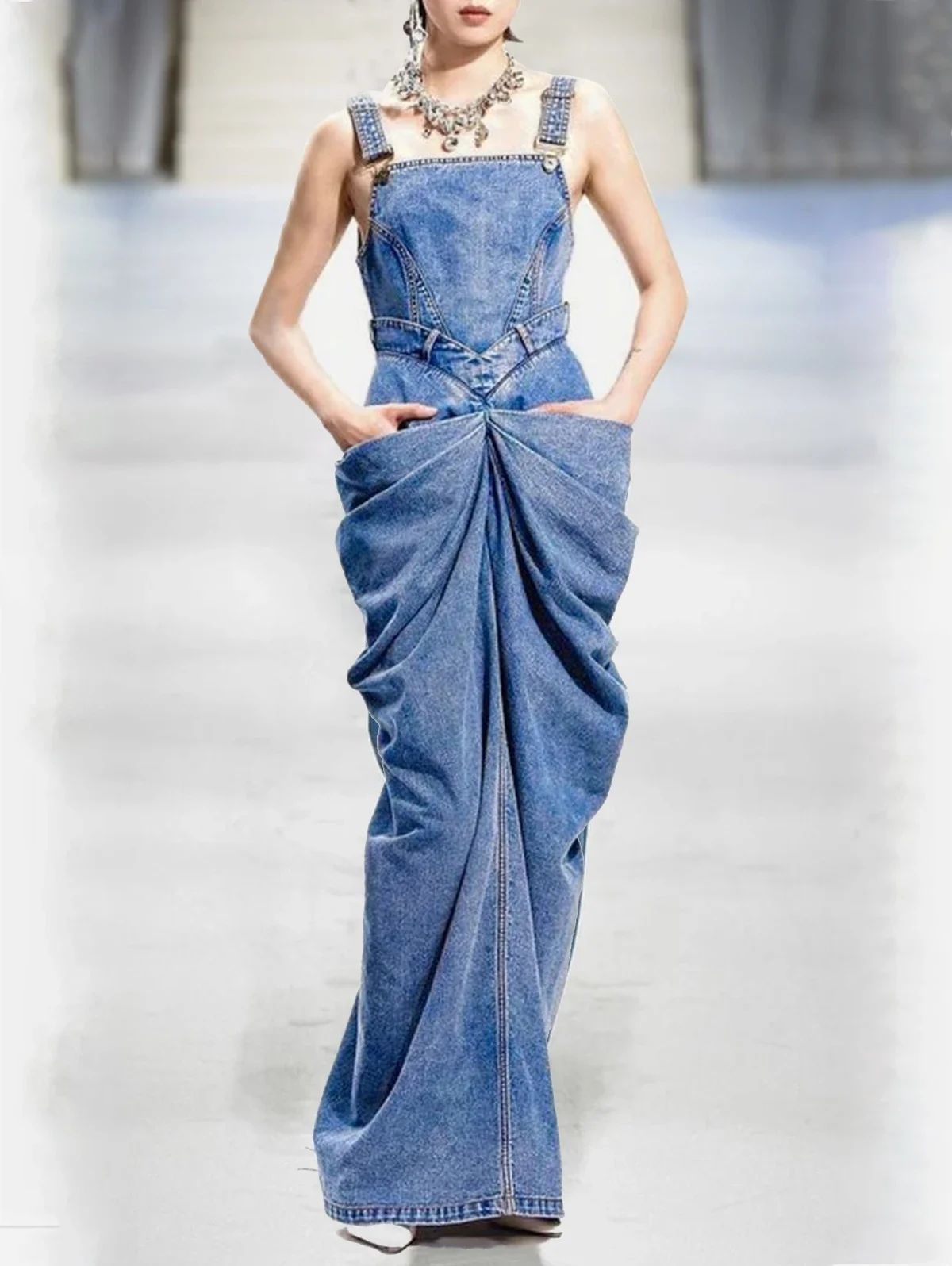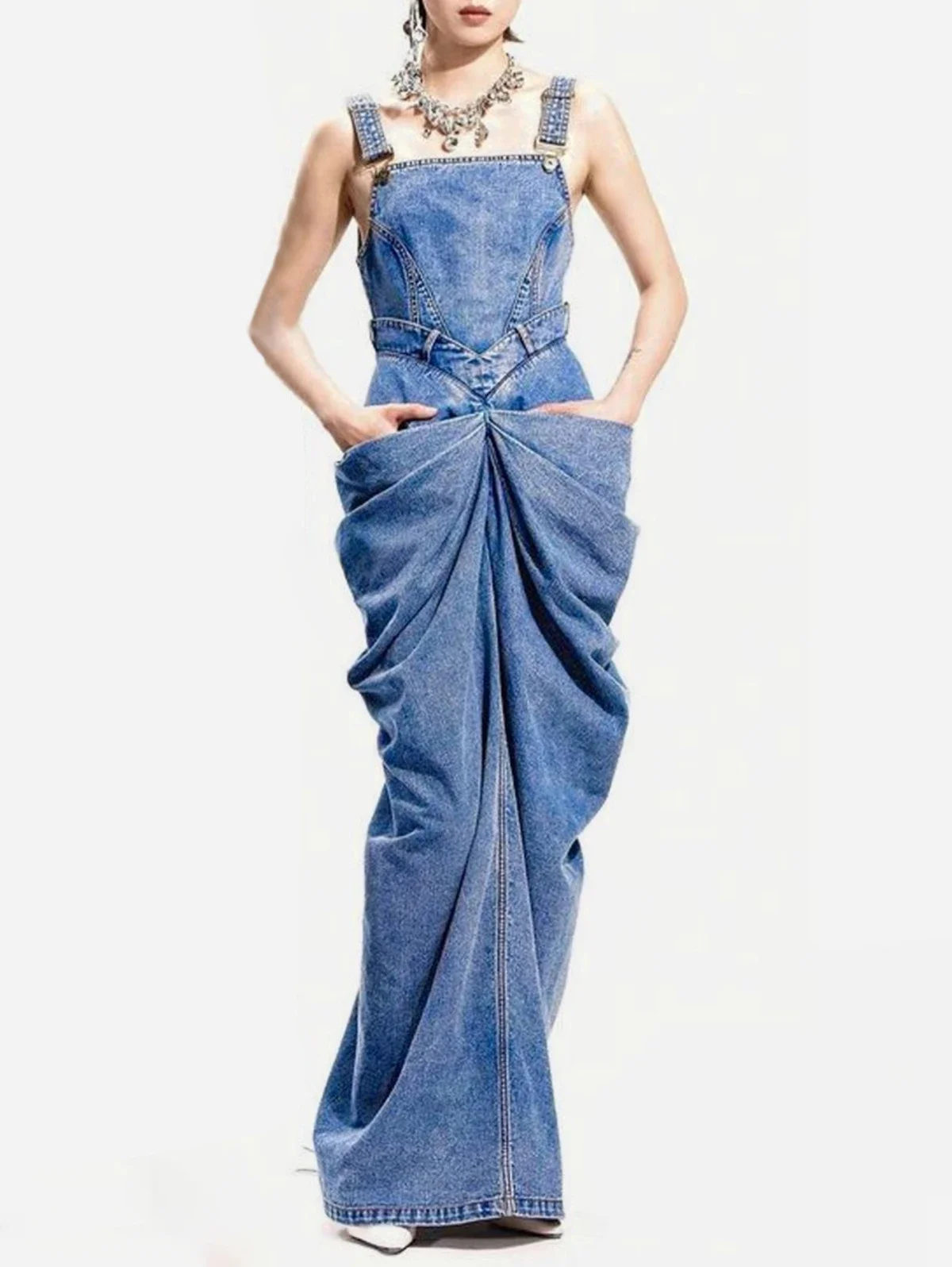 Fashion Buckle Sleeveless Ruched Design Denim Maxi Dress Vintage Elegant Bodycon Party Casual Straight Dress for Summer 2024