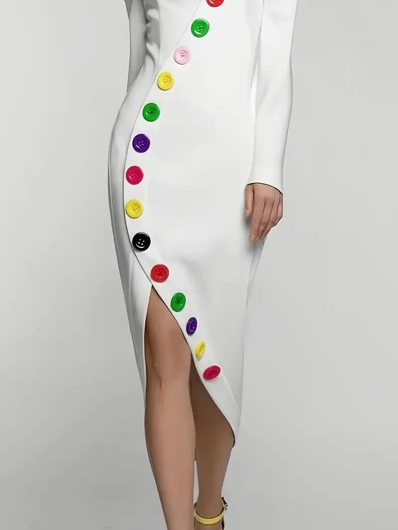 Fashion Colorful Buttoned Bodycon Dress for Women High-Neck Long Sleeves A-line Dress 2025 Autumn X-shape Asymmetrical Dresses