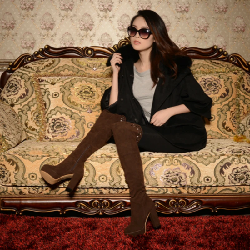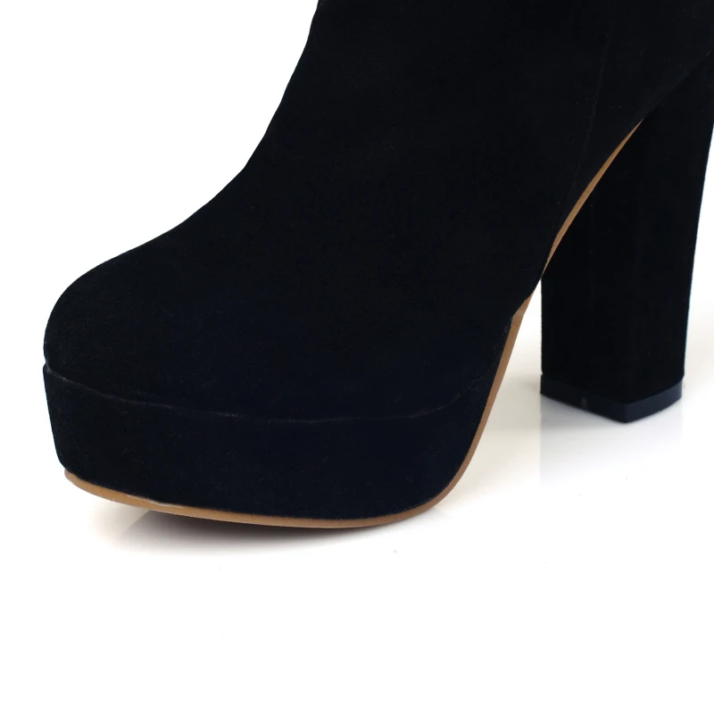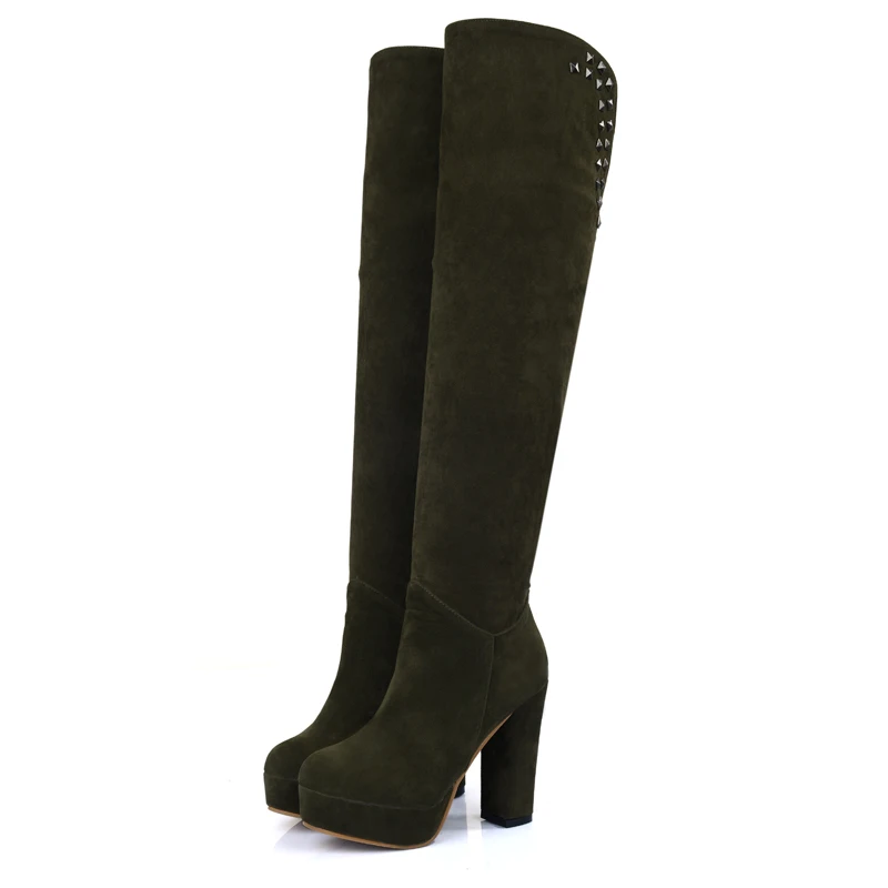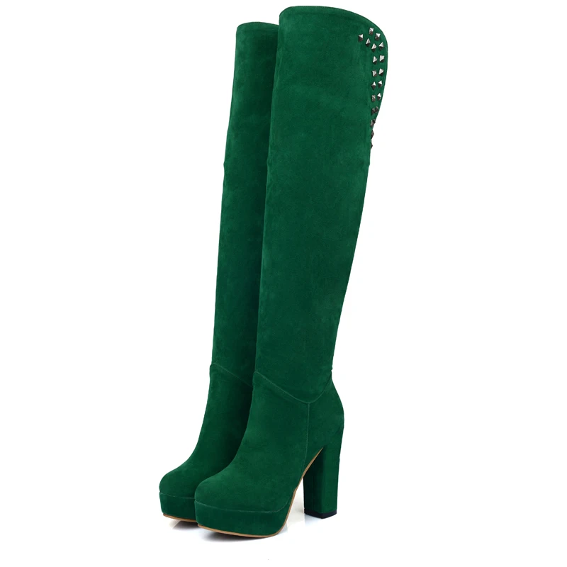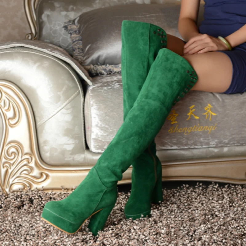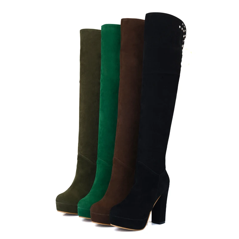 Fashion Knee High Boots Women Soft Velvet Green Brown Long Boot Shoes Block High Heels Platform Winter Boots Lady Large Size 48