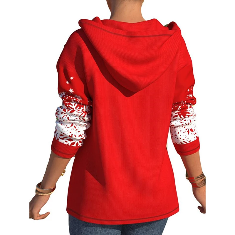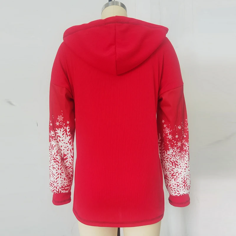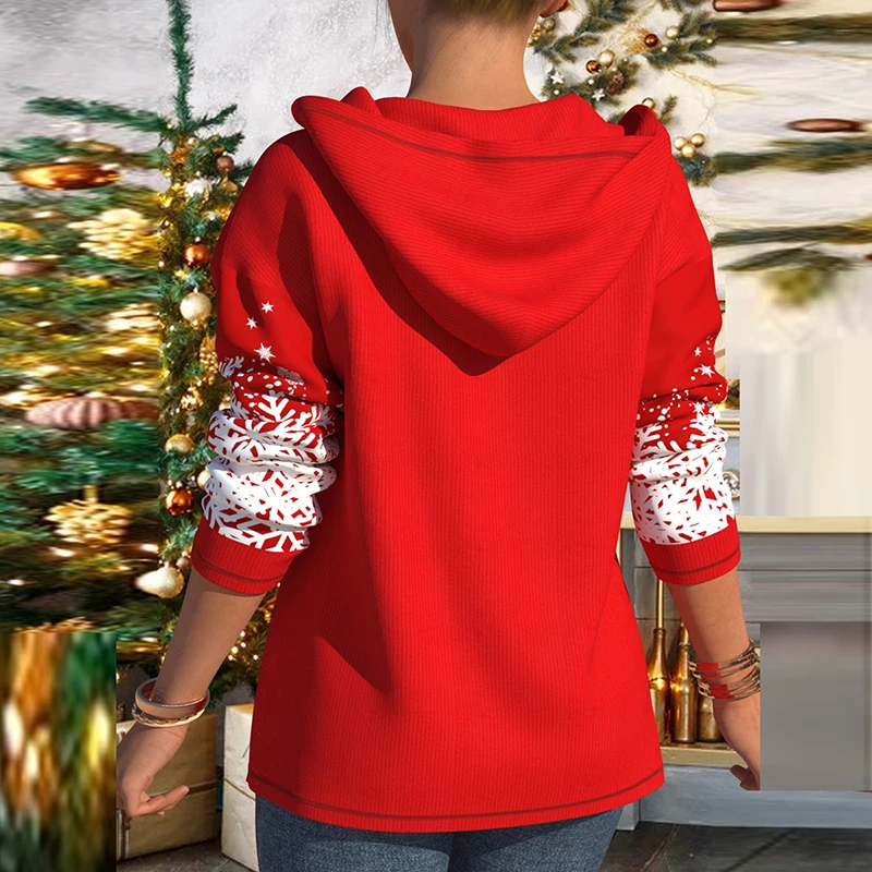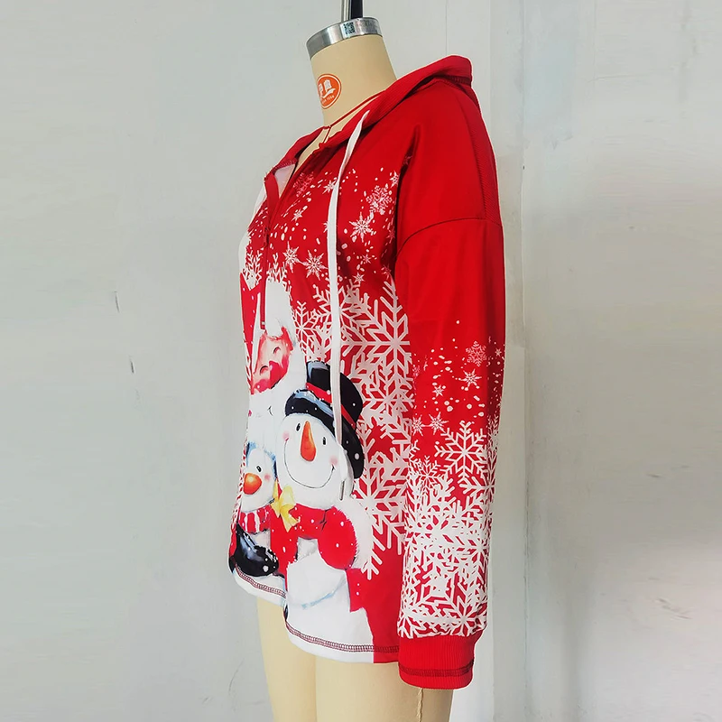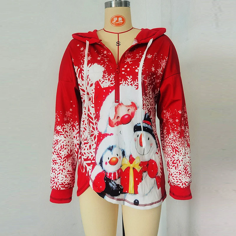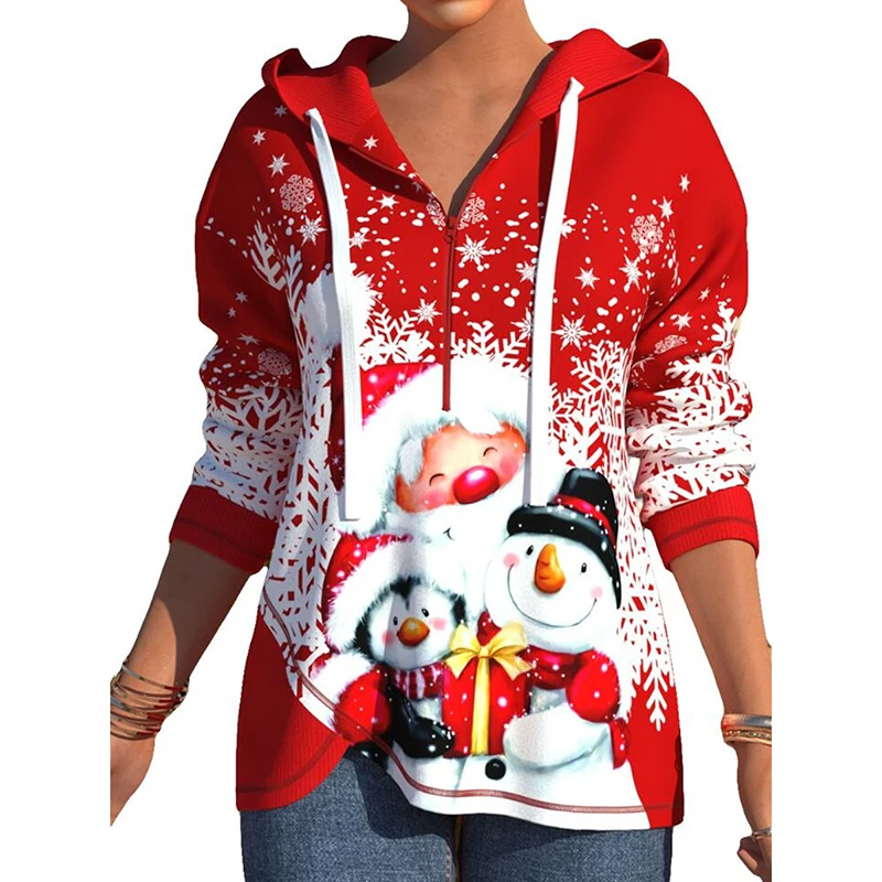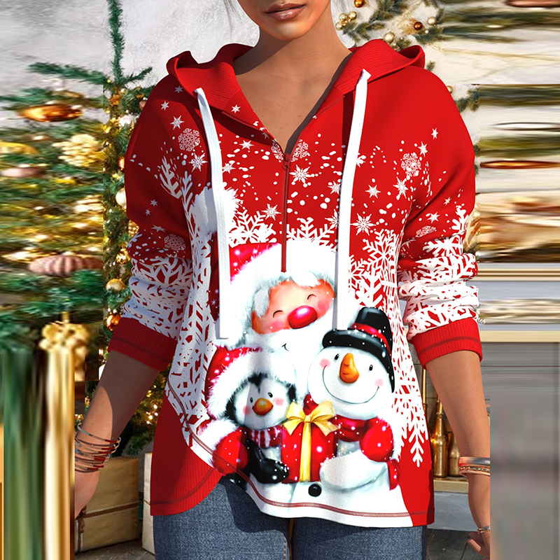 Fashion Loose Blouse Autumn Long Sleeve Zipper Drawstring Hooded Sweatshirt Vintage Santa Claus Printed Ladies Pullover Tops