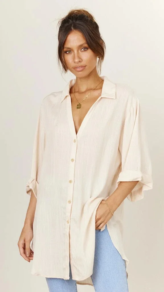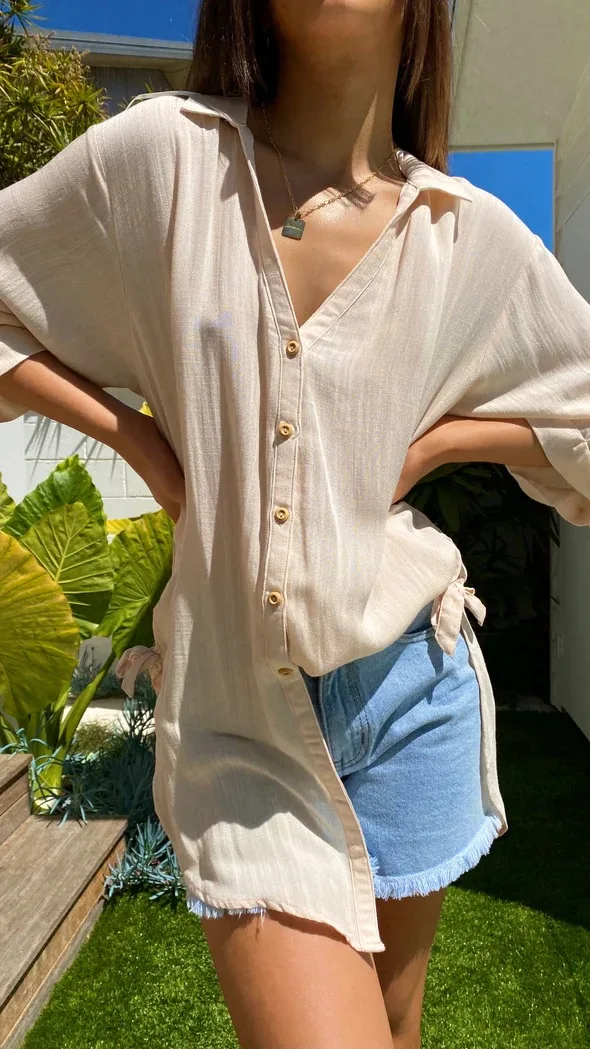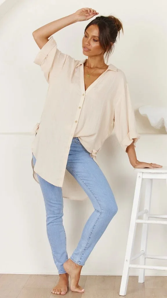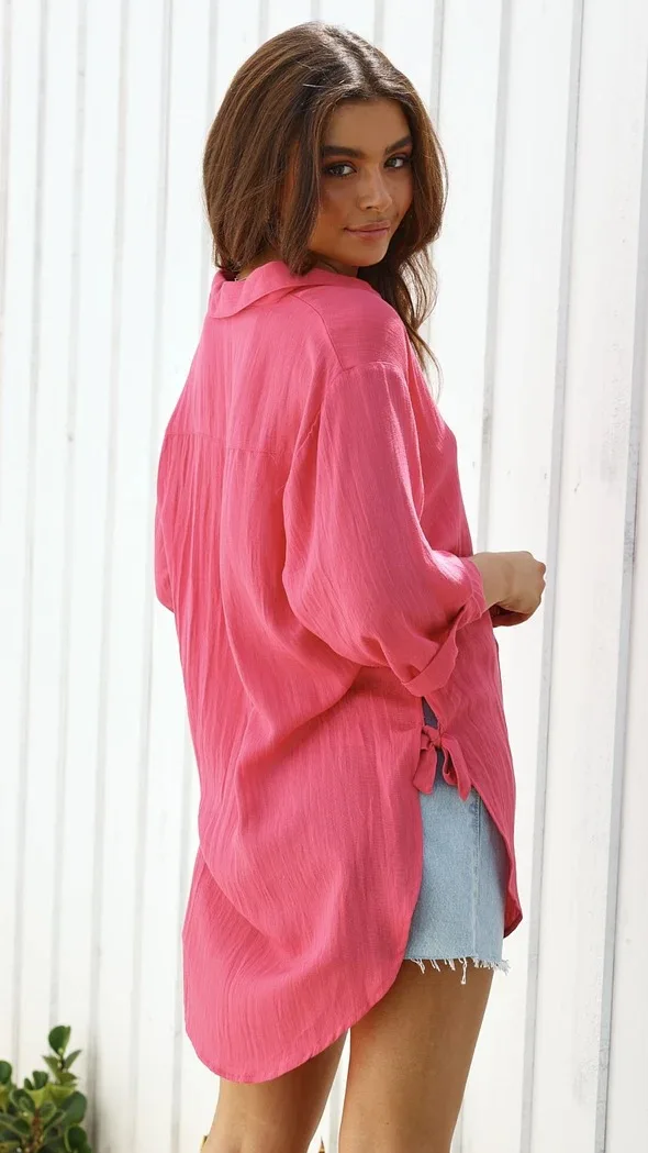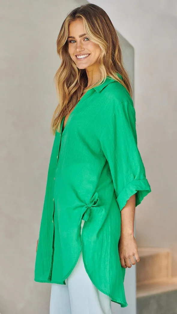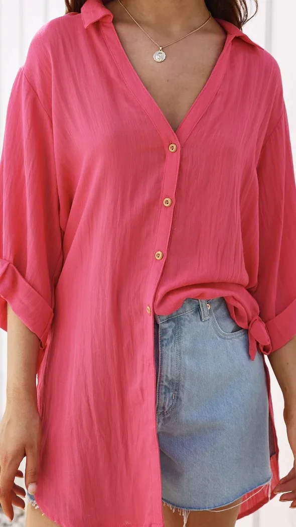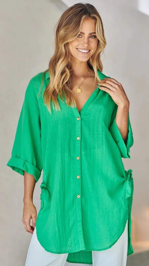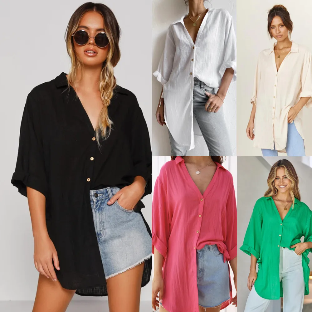 Fashion New Women's Side Tie Seven-point Trumpet Sleeve Dovetail Casual Solid Color Cotton And Linen Long Shirt Femme Blusas