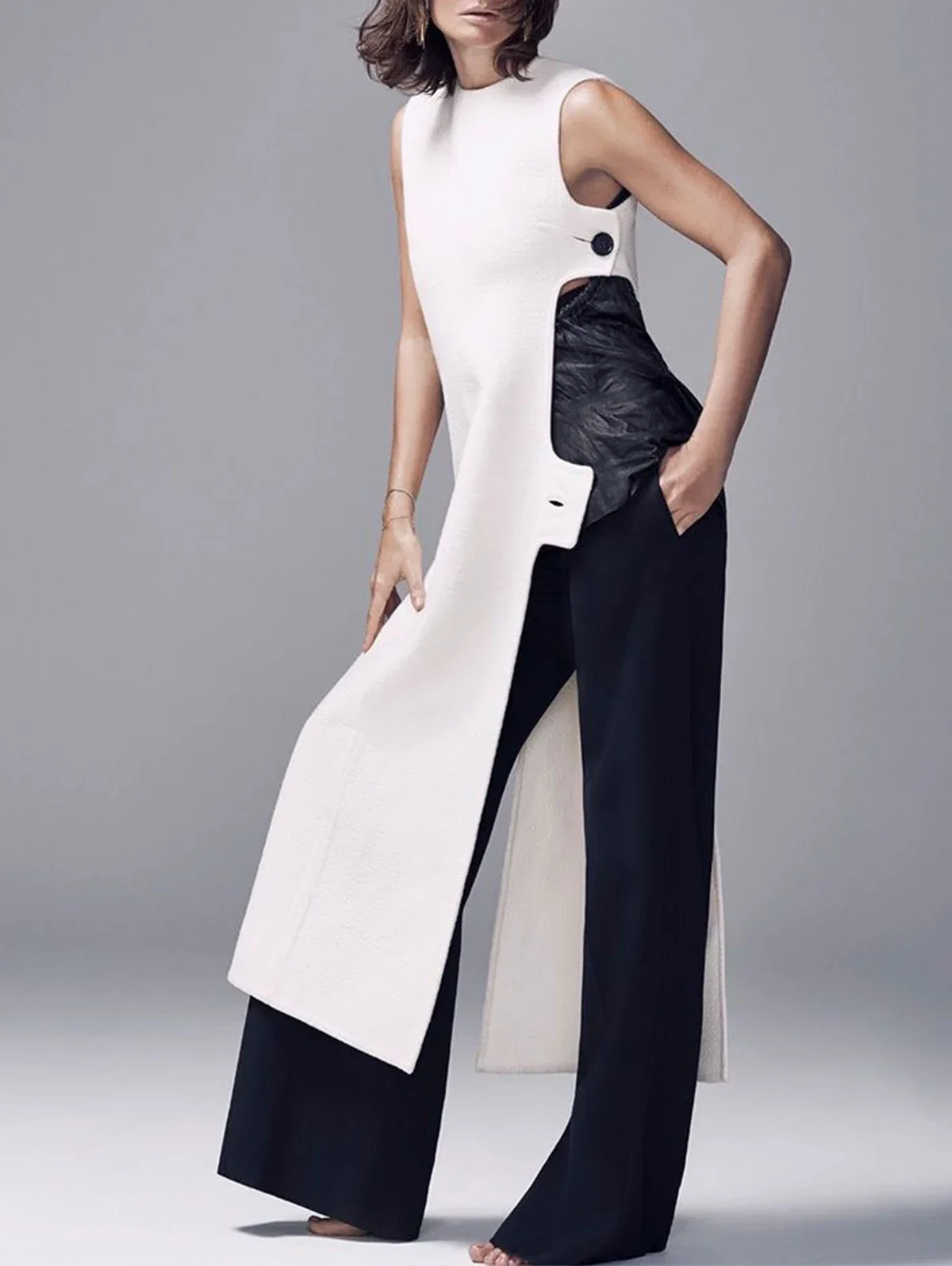 Fashion Plain Crew Neck Sleeveless Button Slit Dress Sexy Vintage Casual Chic Summer Slim Single Button High Street Long Dress