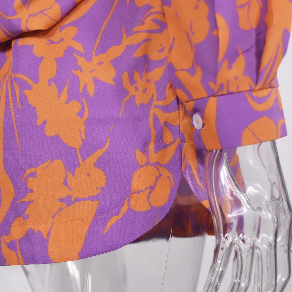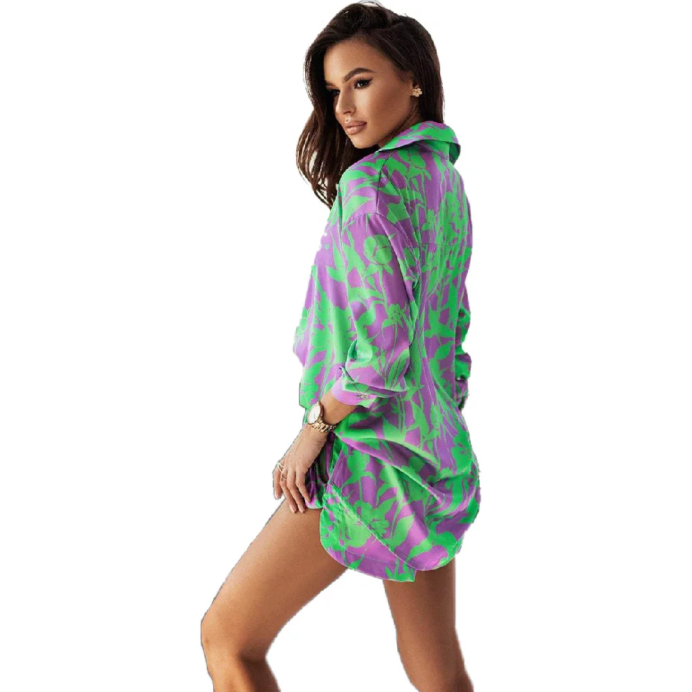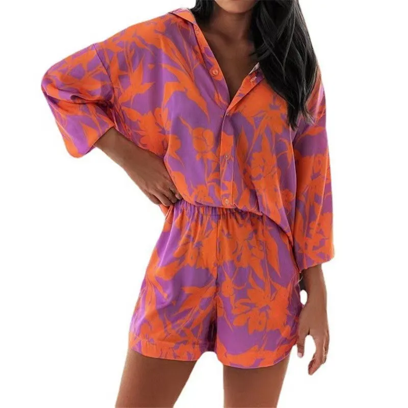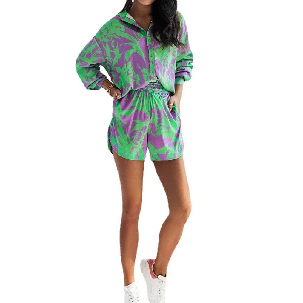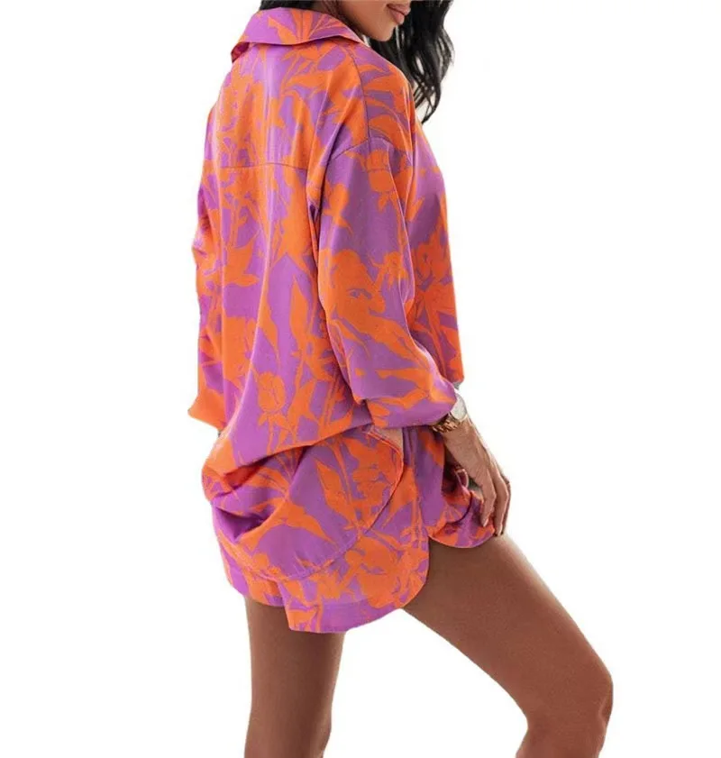 Fashion Print Sets For Women 2022 Summer Casual Bohemian Vacation Long Sleeve Shirt Top Shorts 2 Piece Set Woman Pocket Suit