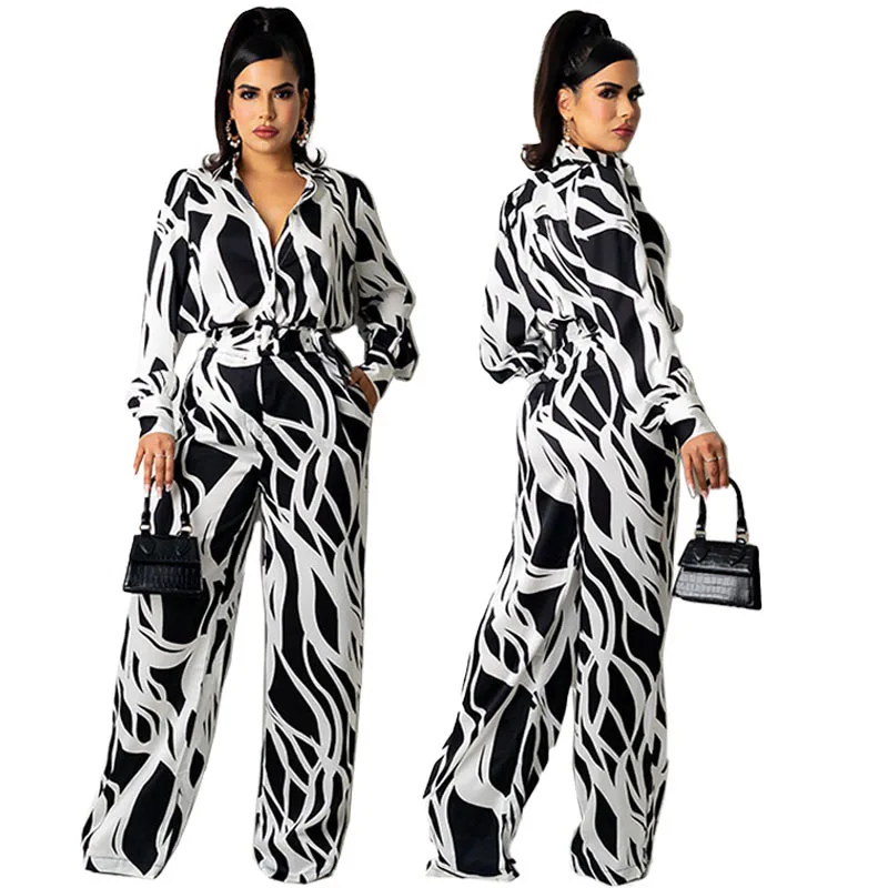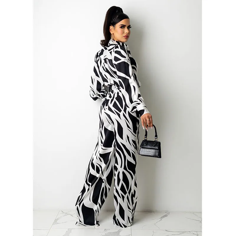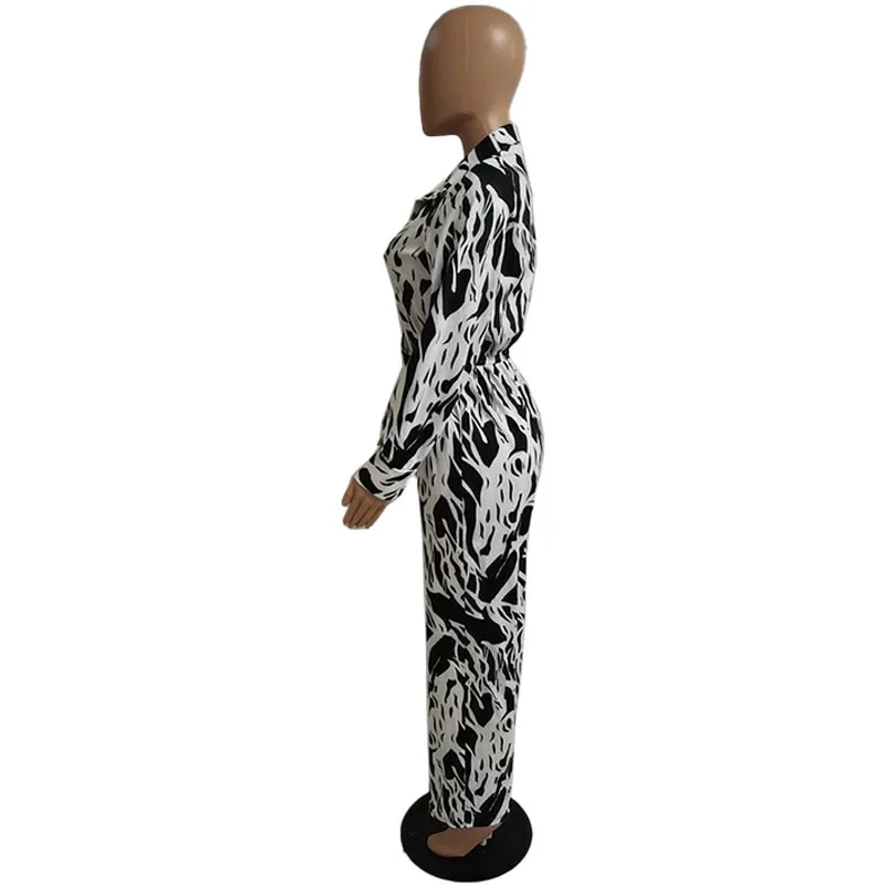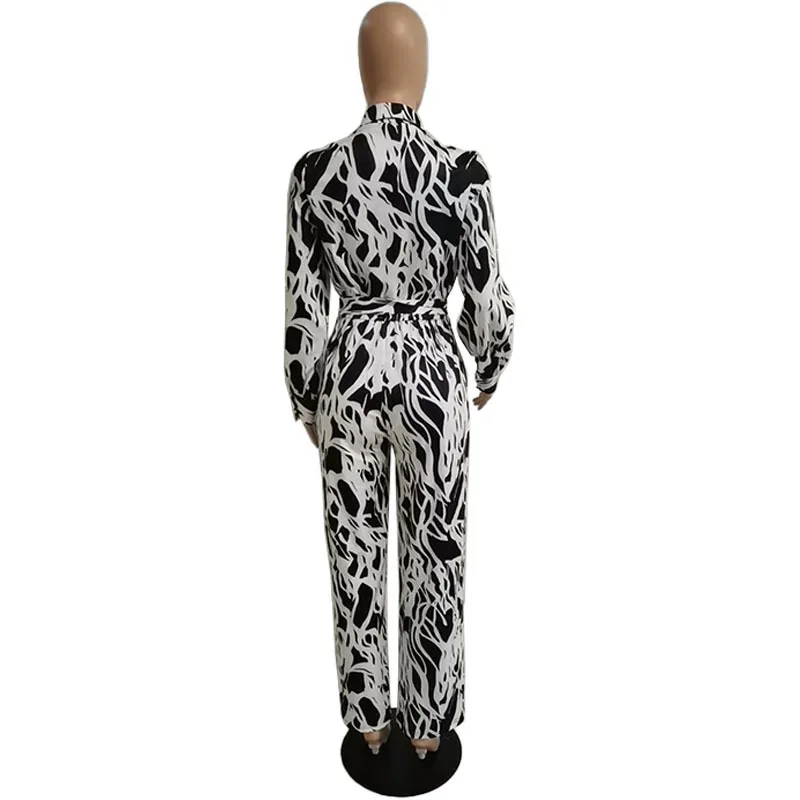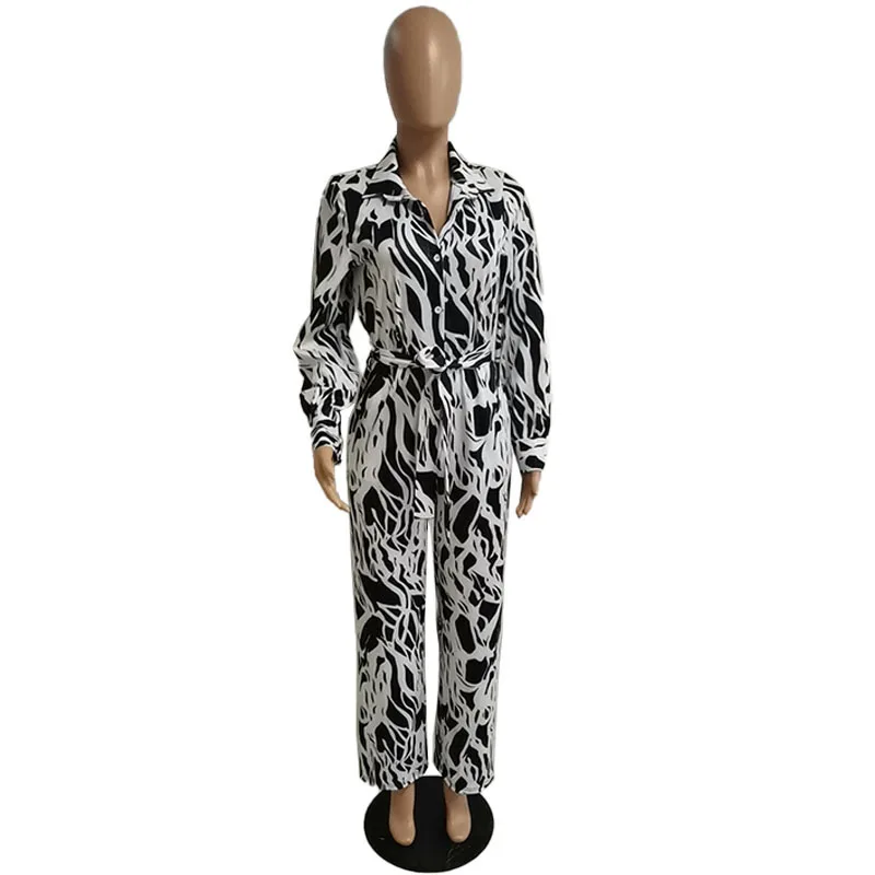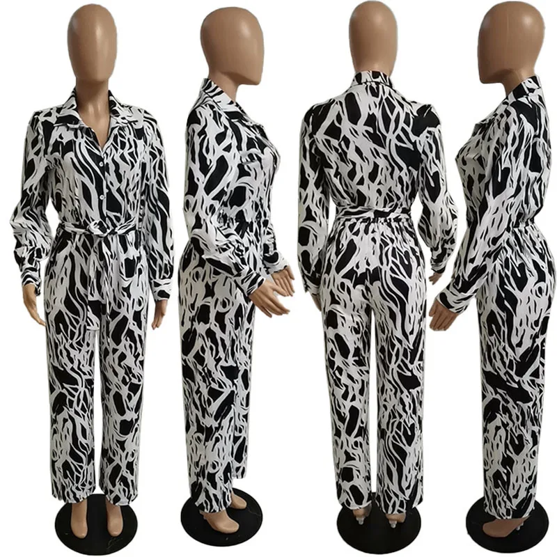 Fashion Printed Women Jumpsuit 2021 Autumn Casual Turn-down Collar Button Cardigan Long Sleeve Wide-Leg Pant Loose Lady Rompers