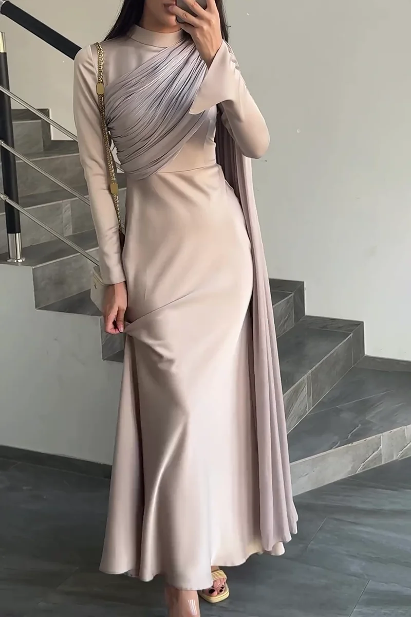 Fashion Satin Solid Robe Dress Women Elegant Long Sleeves High Waist Pleats Long Dress Patchwork Streamer Slim Fit Evening Dress