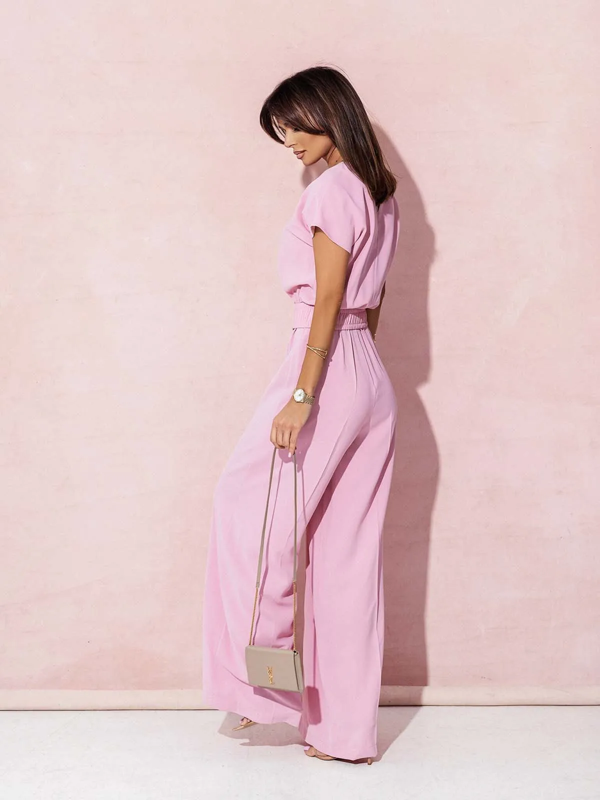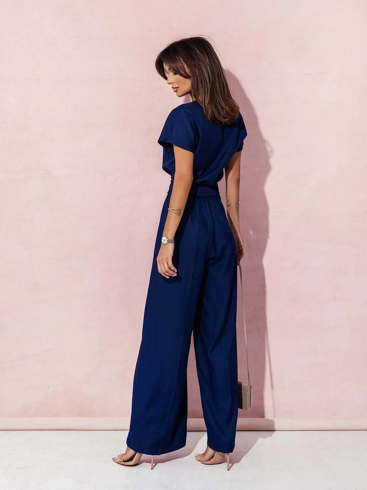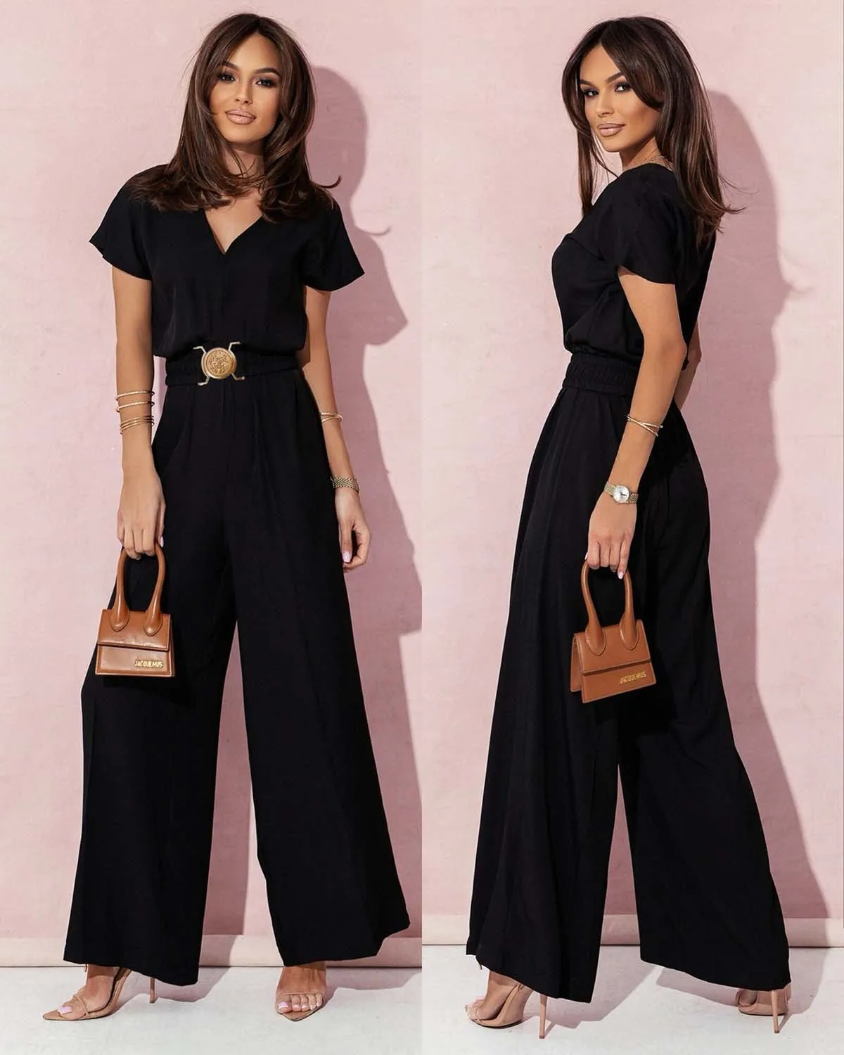 Fashion Short Sleeve Commute Wide Leg Jumpsuit Casual Belt V Neck Loose Jumpsuits Women’s High Waist Temperament Elegant Romper