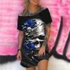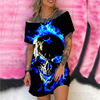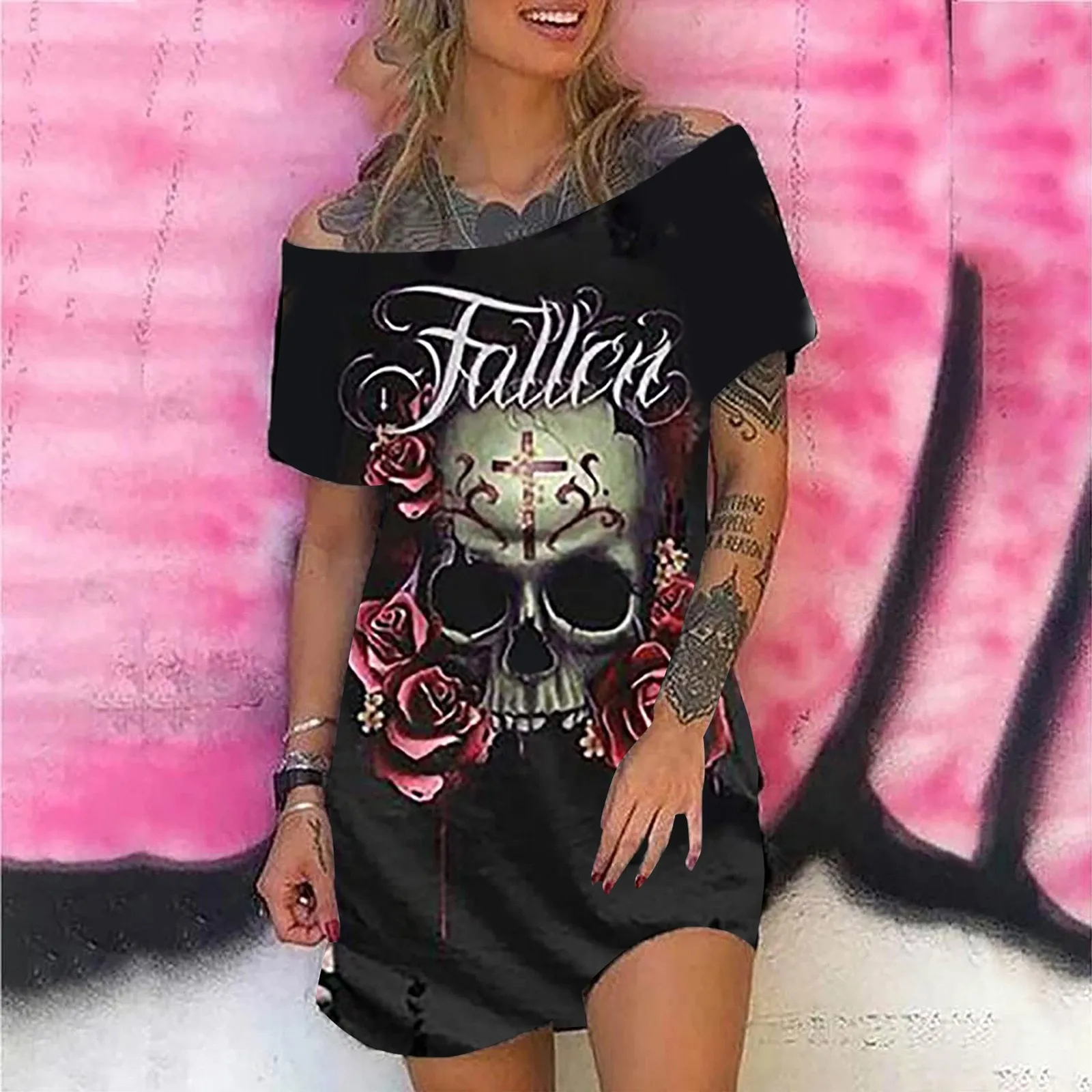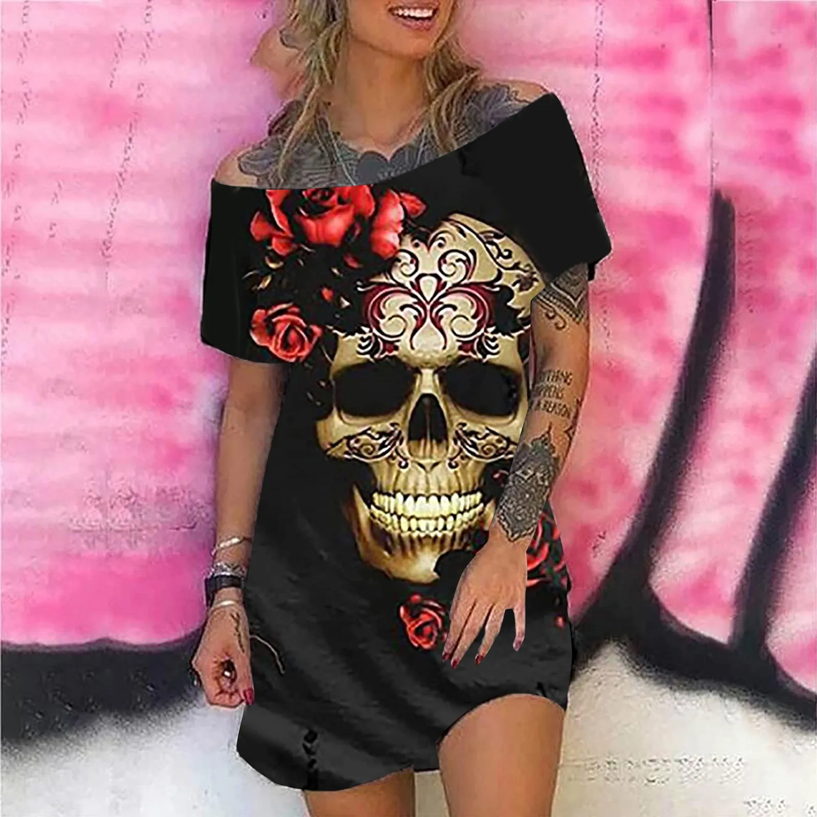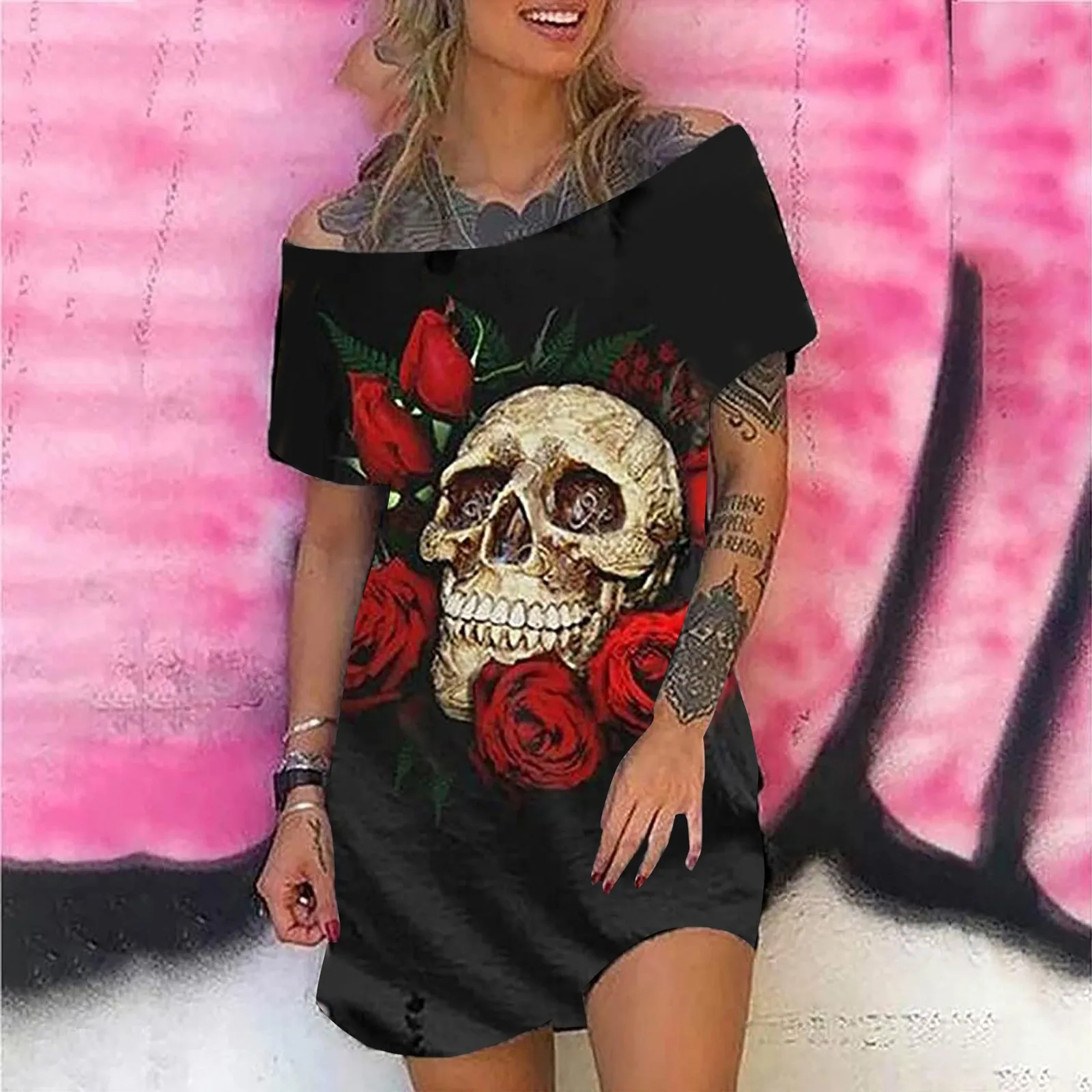 Fashion Short Sleeve Dress Women Casual Skull Floral Print Party Dress Lady Sexy Slash Neck Mini Dress Summer Street Loose Dress