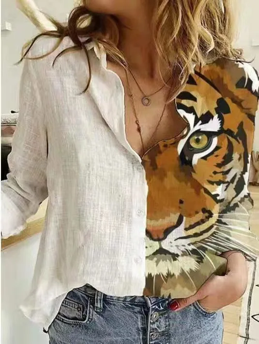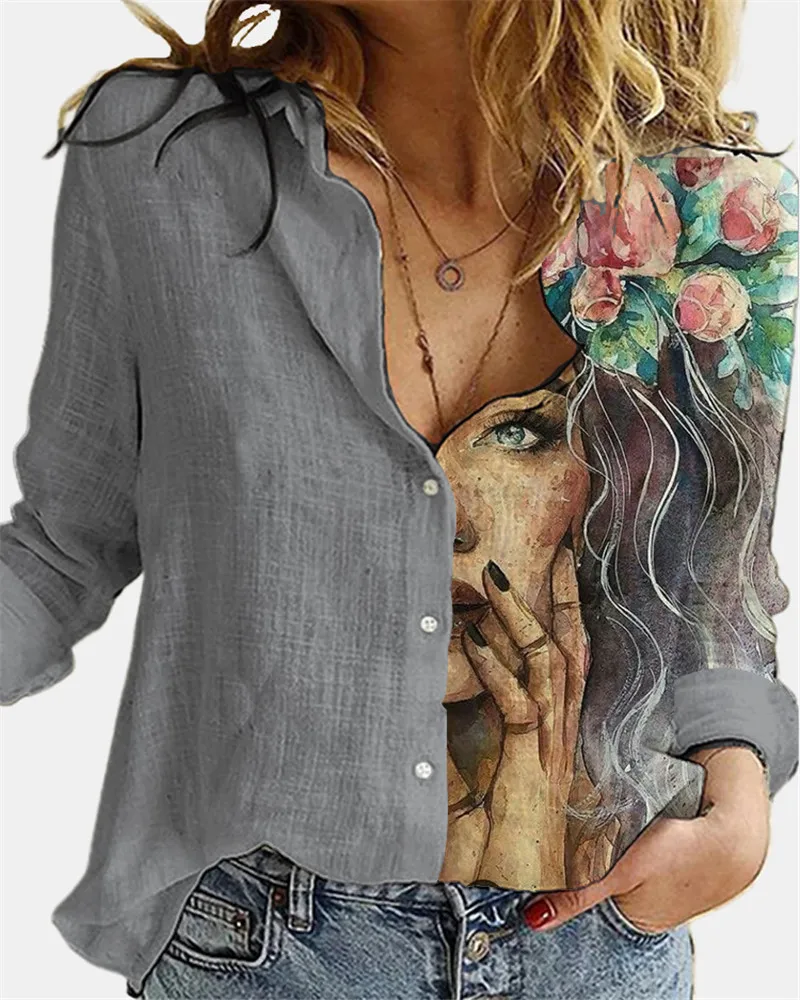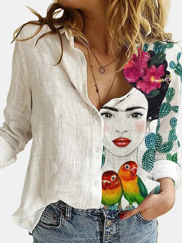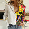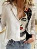 Fashion Stitching Retro Face Print Long Sleeve Blouse Women 2022 Spring Lapel Button Casual Top Lady 3XL Cotton Polyester Shirts