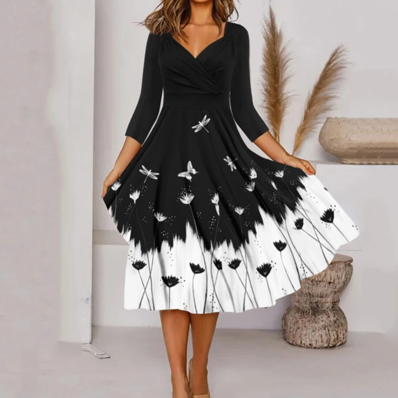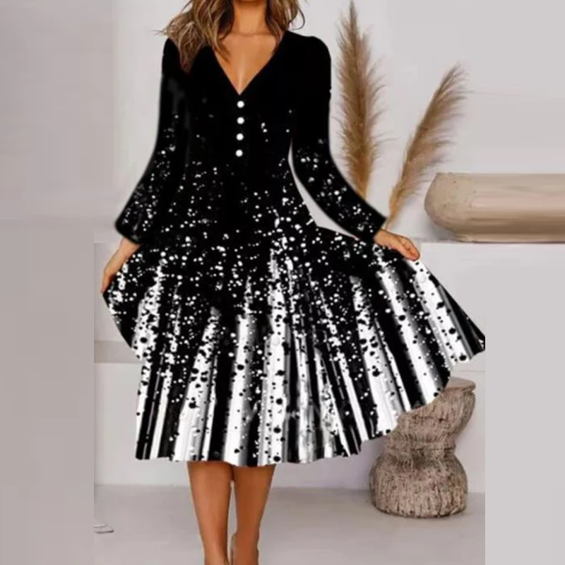 Fashion Striped Print A-Line Party Dress Women Elegant Buttoned V Neck Office Dress Spring Autumn Half Sleeve Loose A-Line Dress