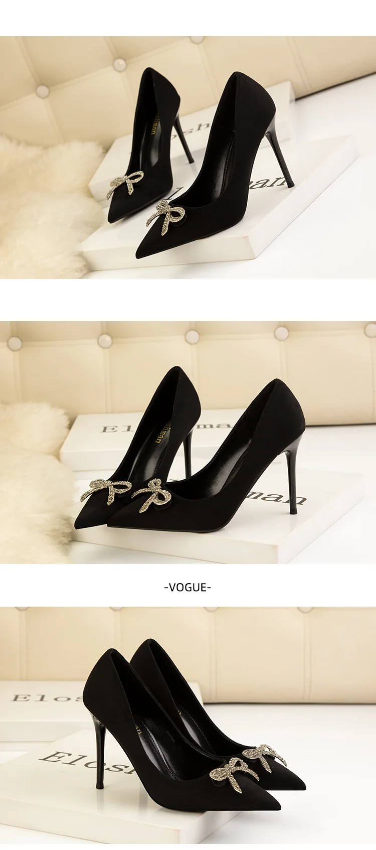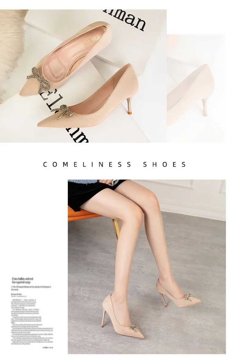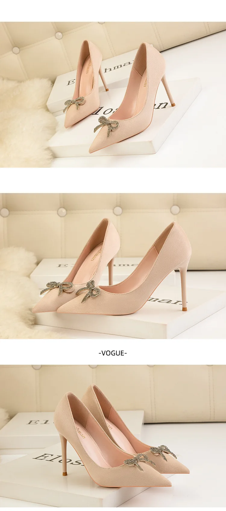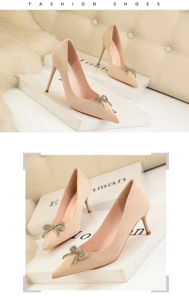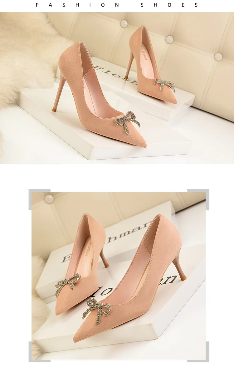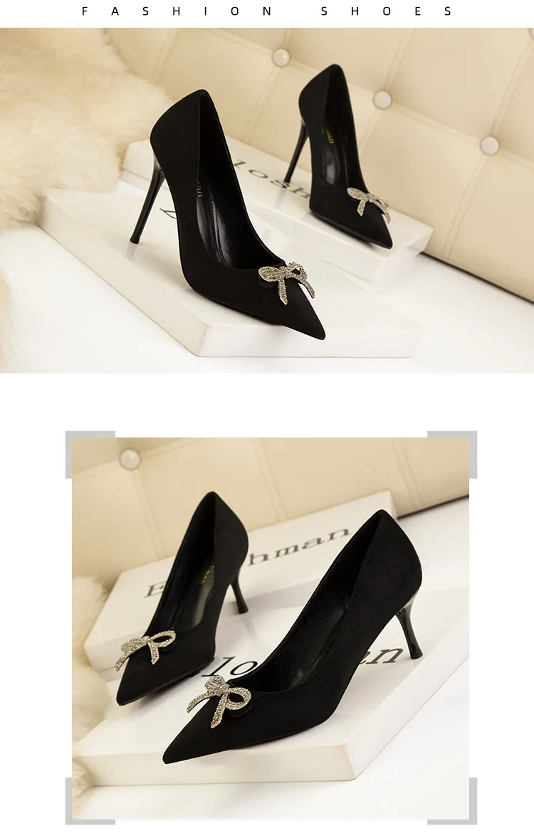 Fashion Sweet Beauty High Heels Stiletto High Heels Shallow Mouth Pointed Rhinestone Bow Women's High Quality Single Shoes