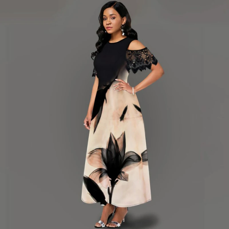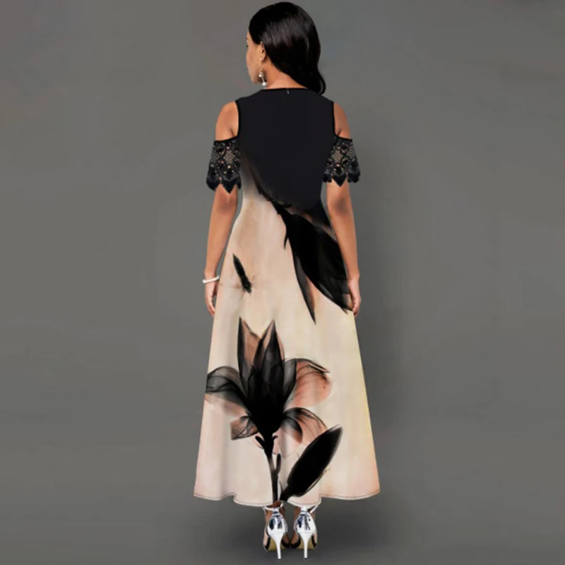 Fashion Vintage Long Dress Women Sexy Lace Short Sleeve Off-shoulder O-neck Party Dress 2021 Summer Floral Printed Elegant Dress