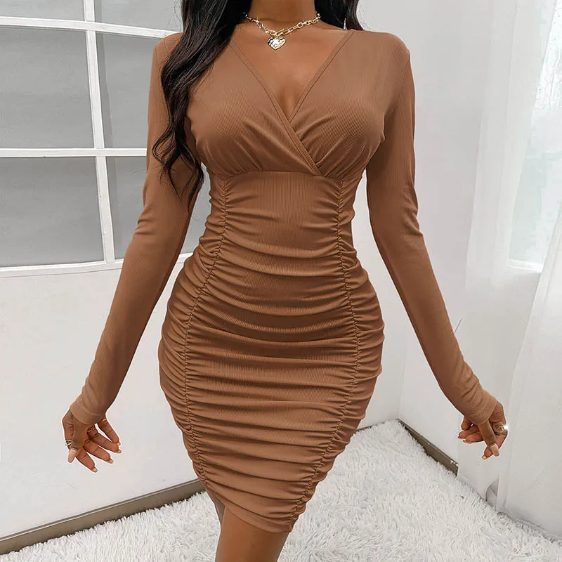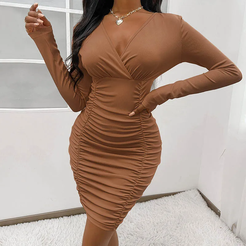 Fashion Women Dress 2021 Autumn Long-sleeved Sexy Deep V Neck Slim Party Dresses Vintage Solid Elegant Casual Ladies Mini Dress