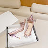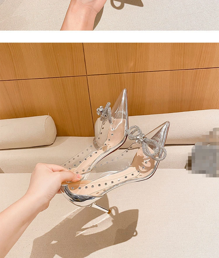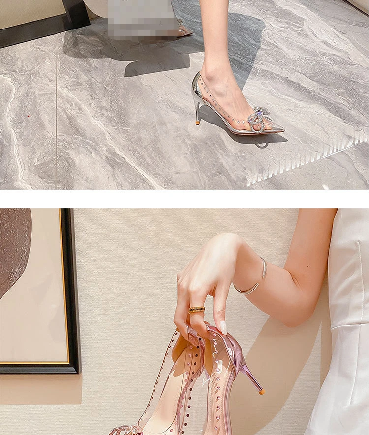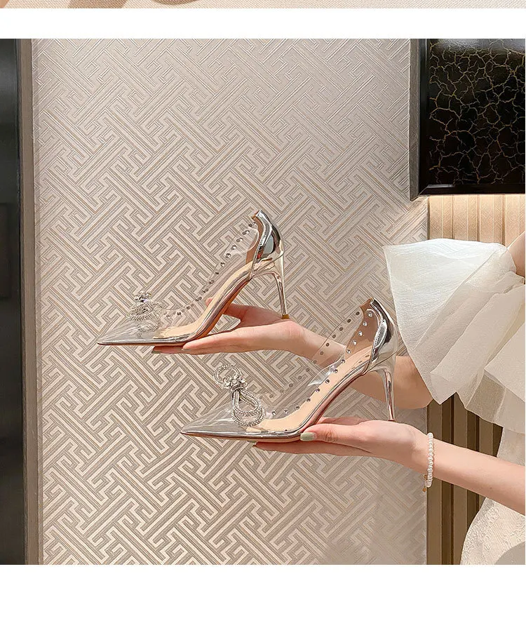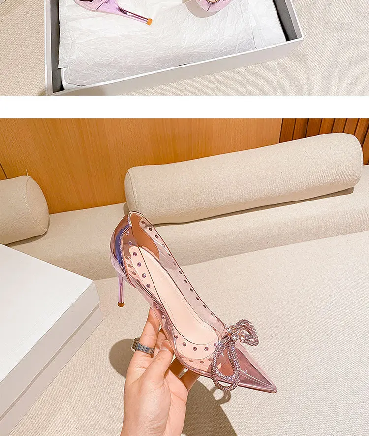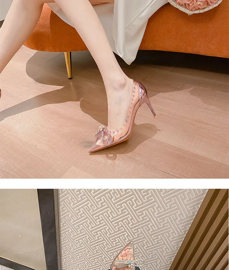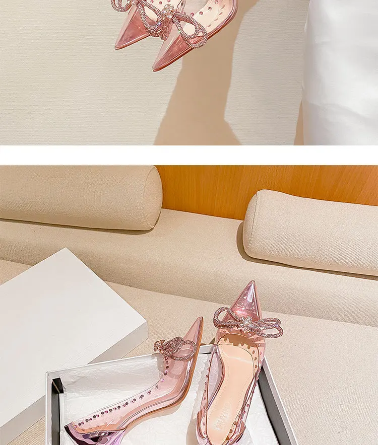 Fashion Women's Crystal Transparent Exquisite High Heels Summer Women's Exquisite Stiletto Pointed Bow Rhinestone Shoes