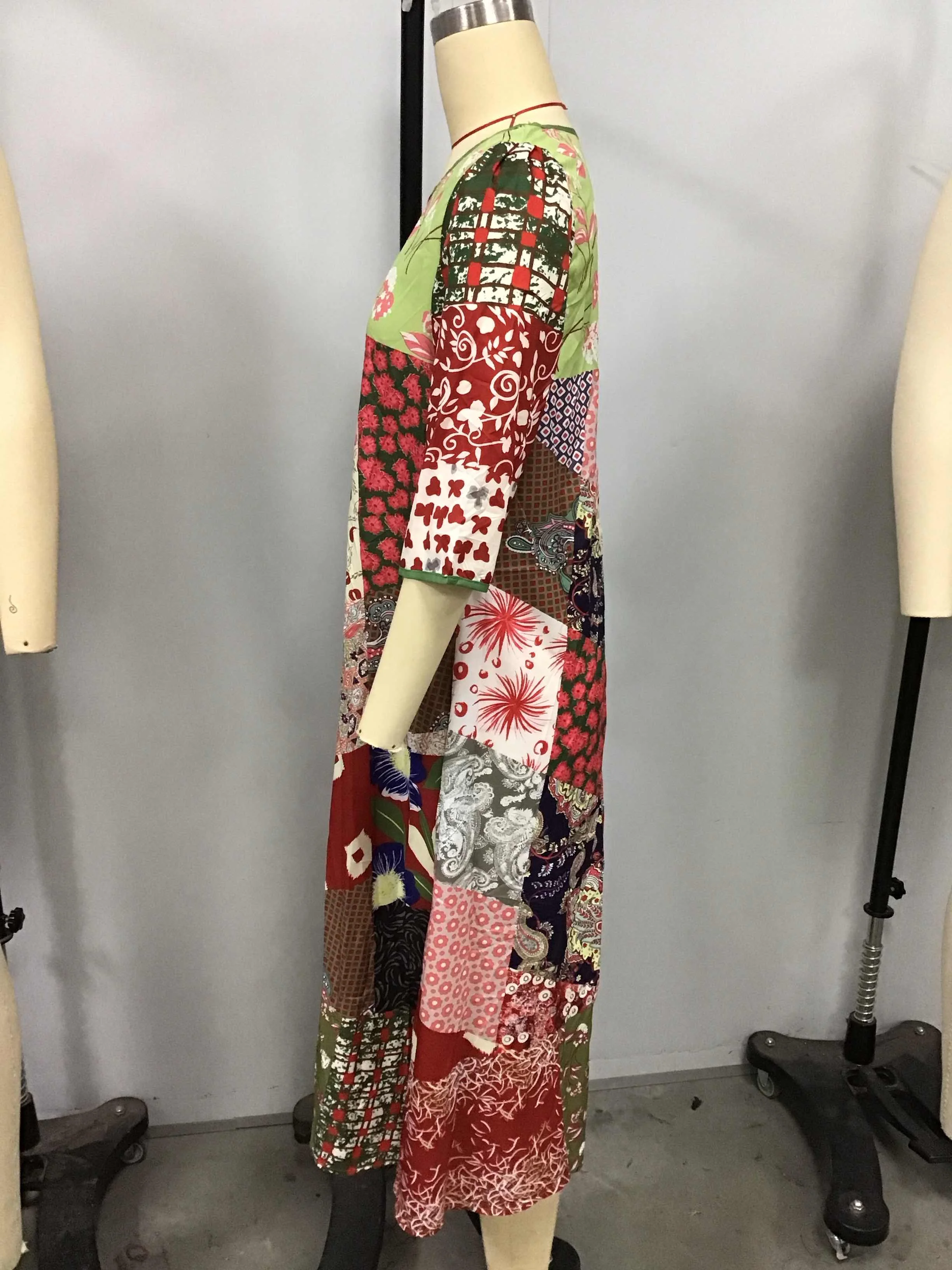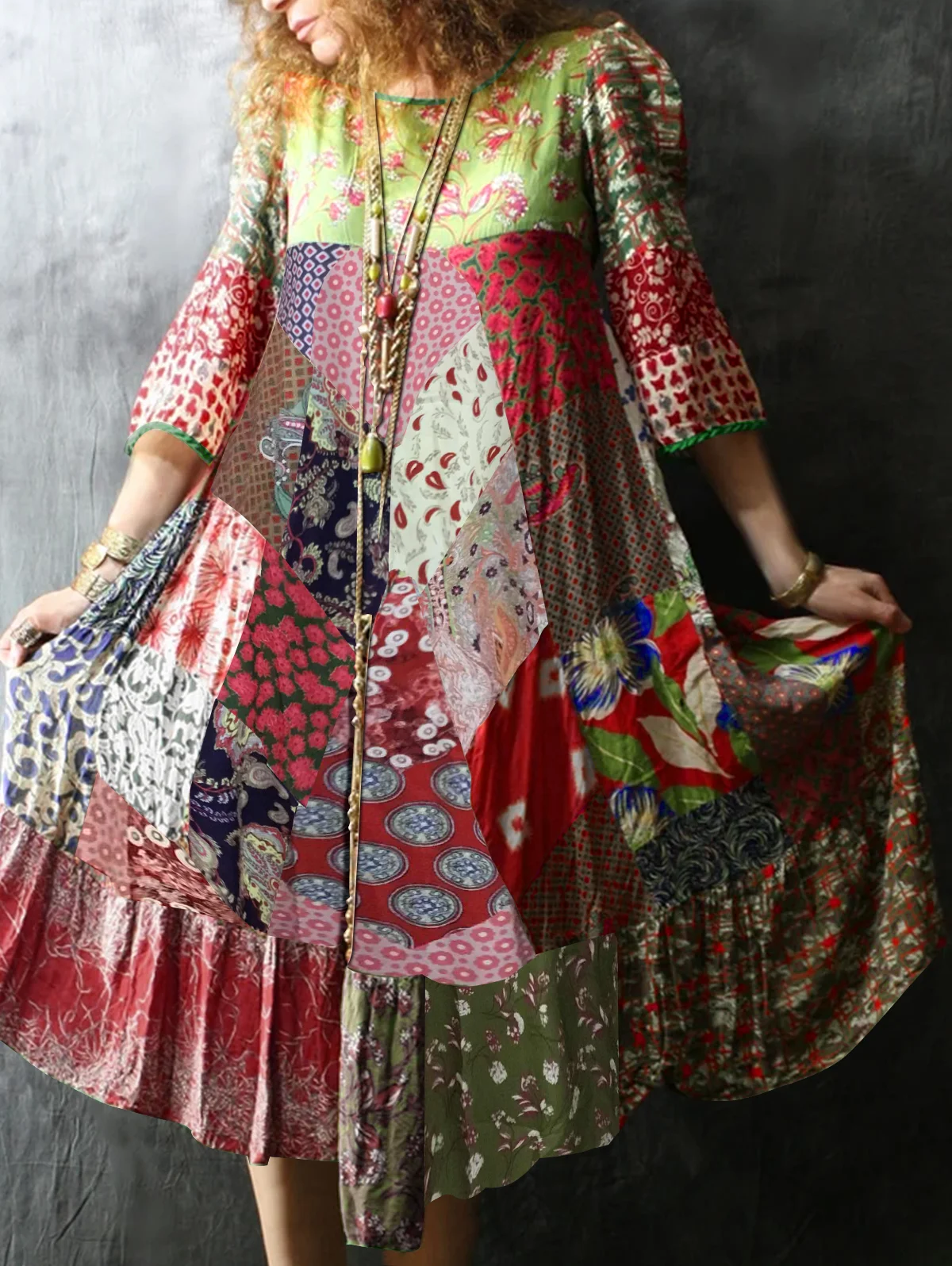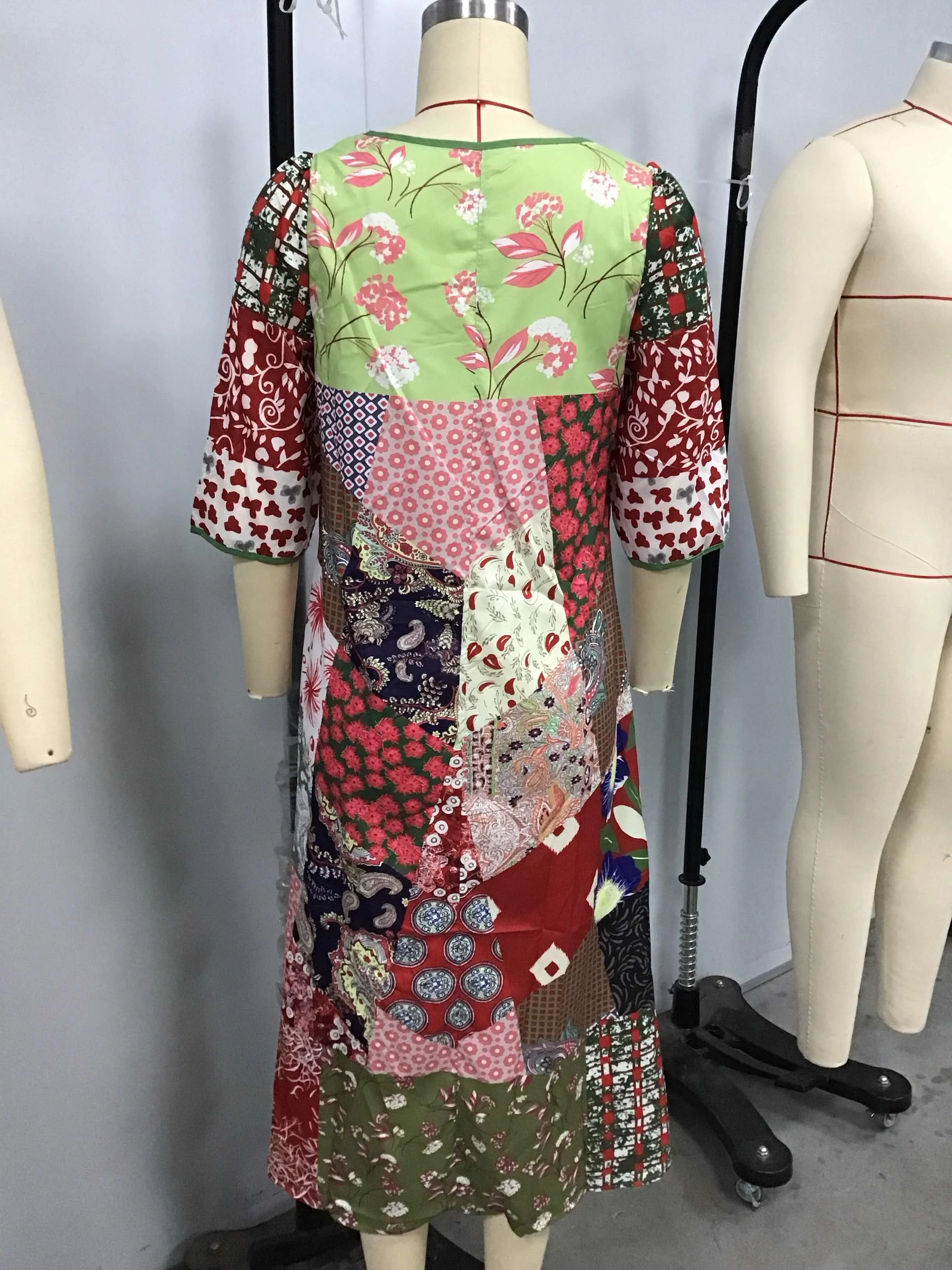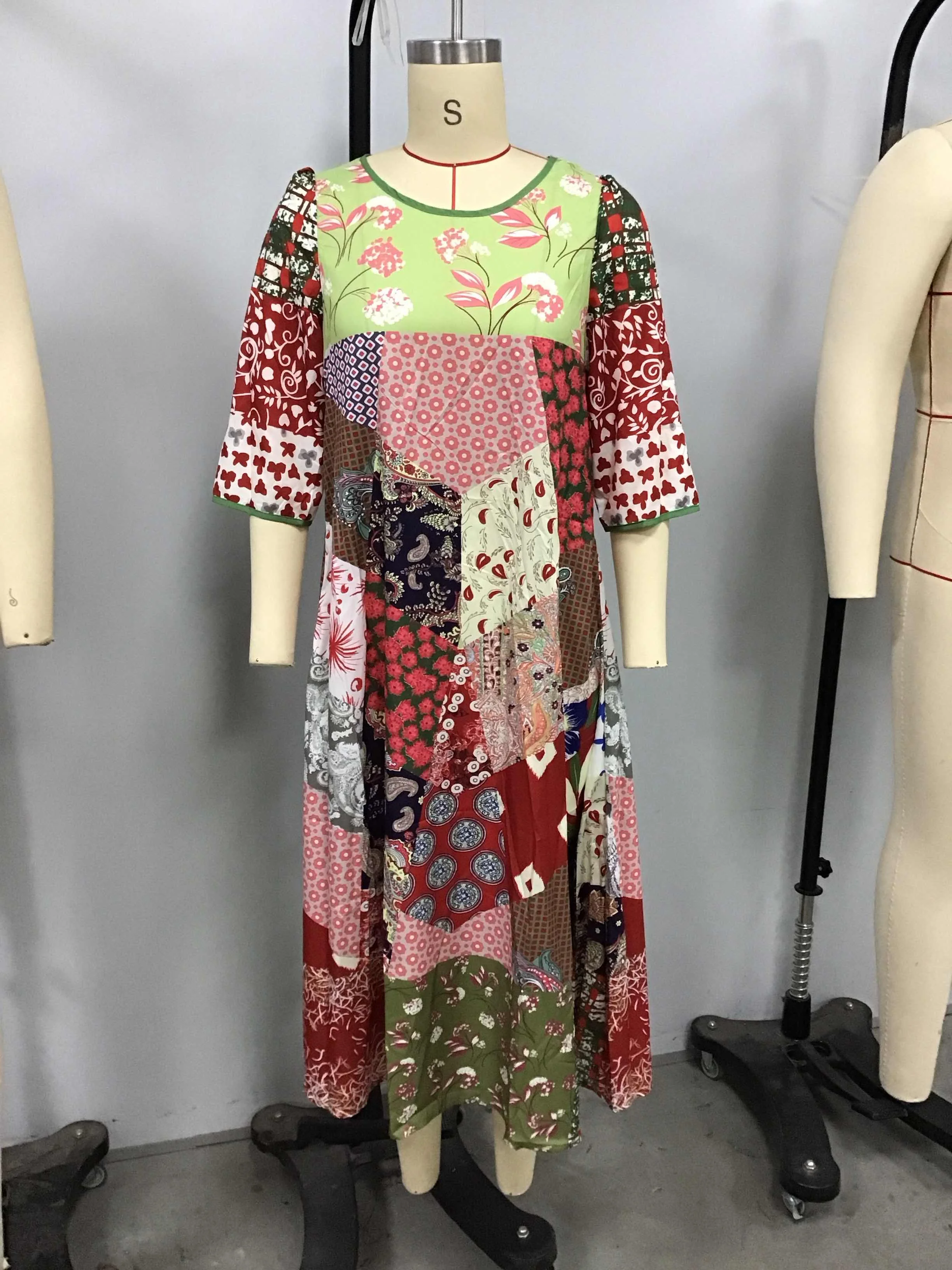 Fashion Women’s Long Dress Vintage Print Crew Neck Loose Bohemian Women’s 3/4 Sleeve Dress Summer Loose Midi Dress Robe 2025