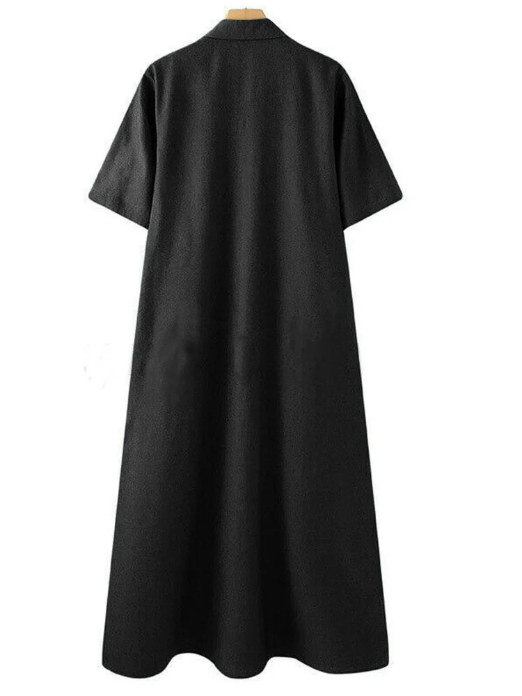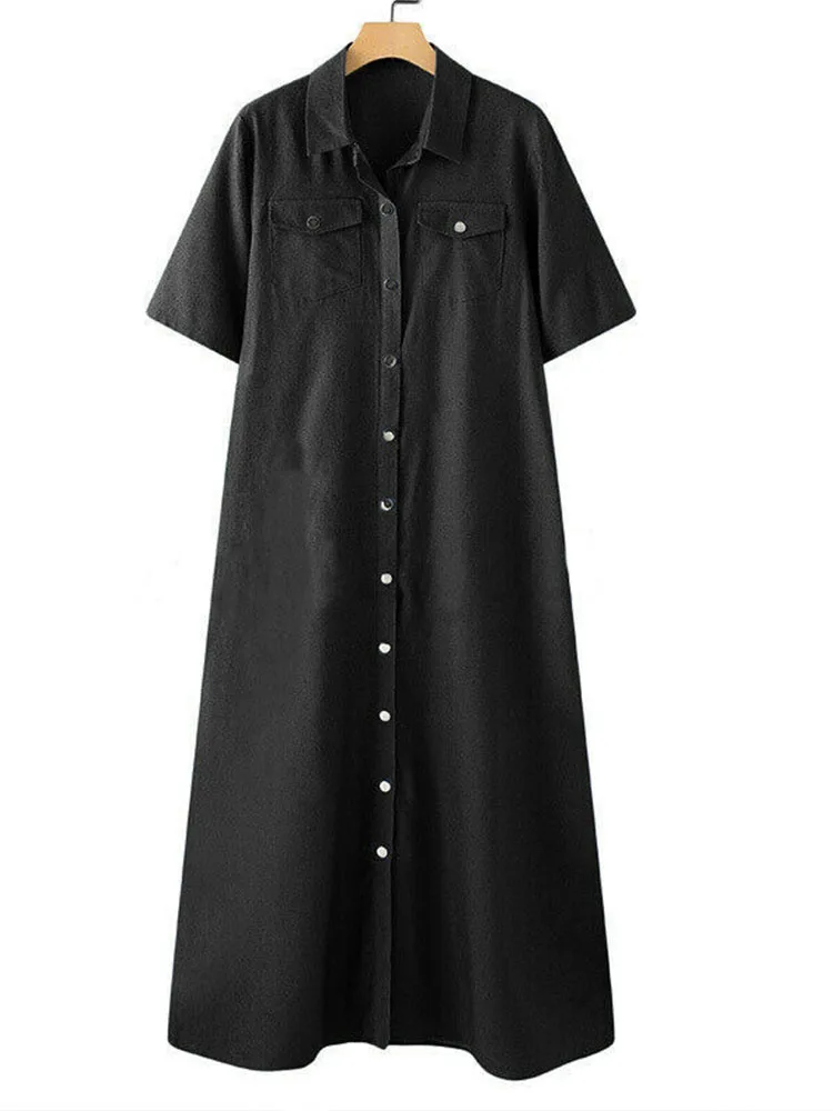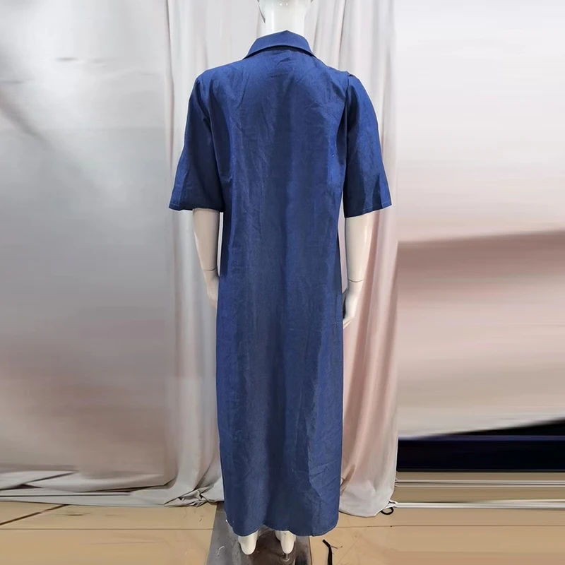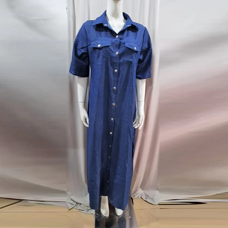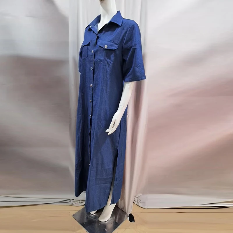 Femme 2022 Fashion Denim Dress Summer Solid Color Short Sleeve Single Breasted Slit Long Dress Women Elegant Maxi Beach Sundress