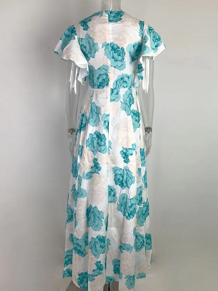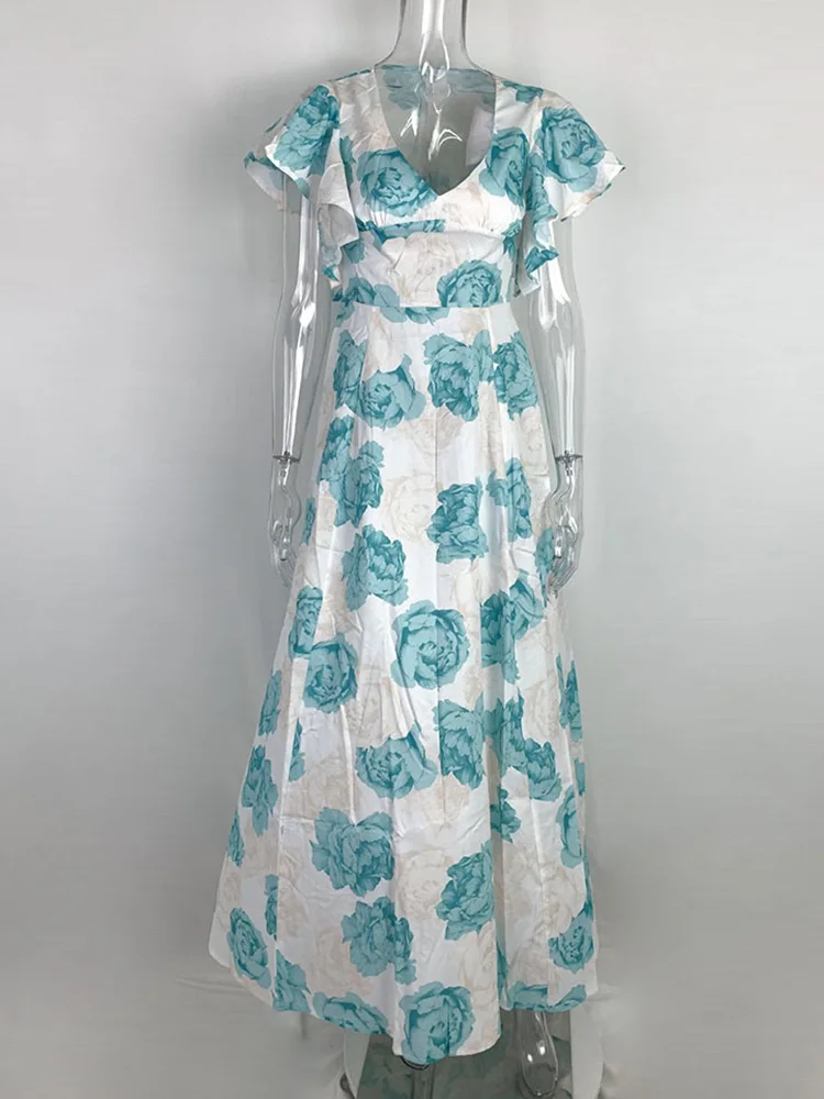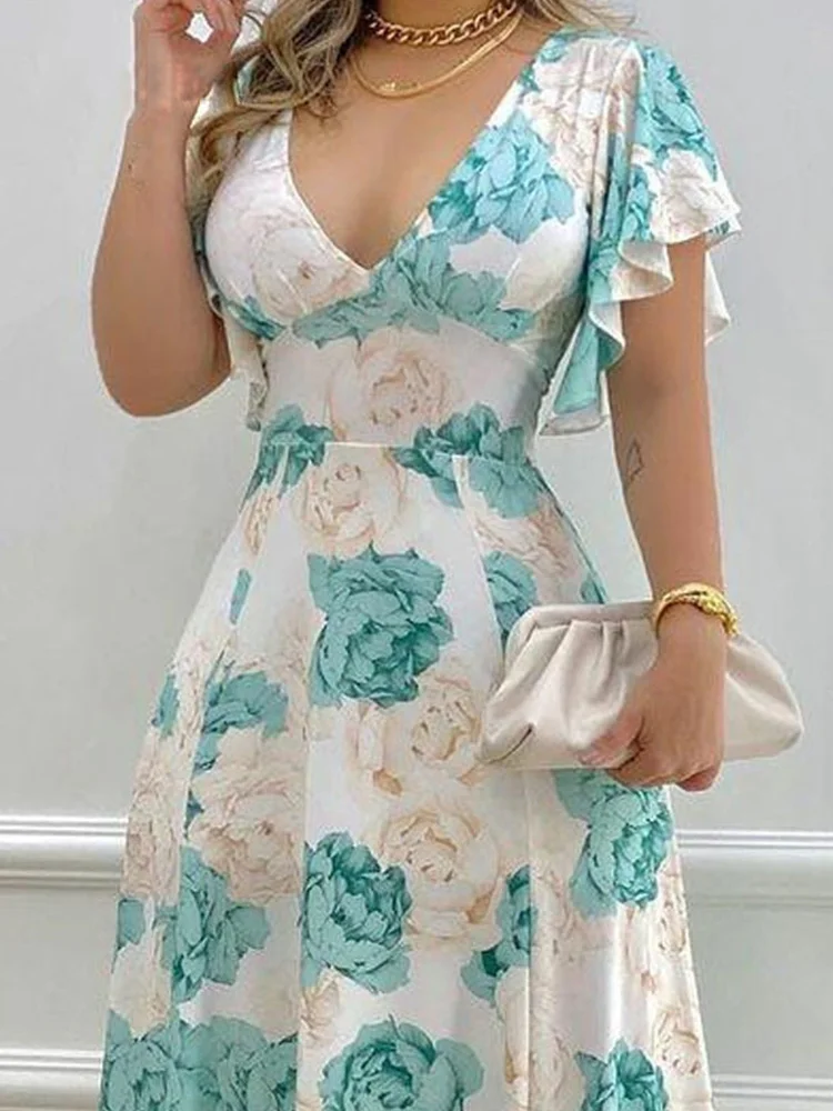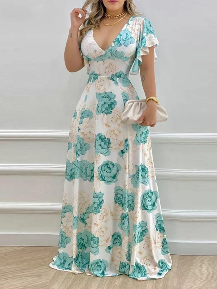 Floral Print Flare Short Sleeve V Ncek Casual Maxi Dress Women