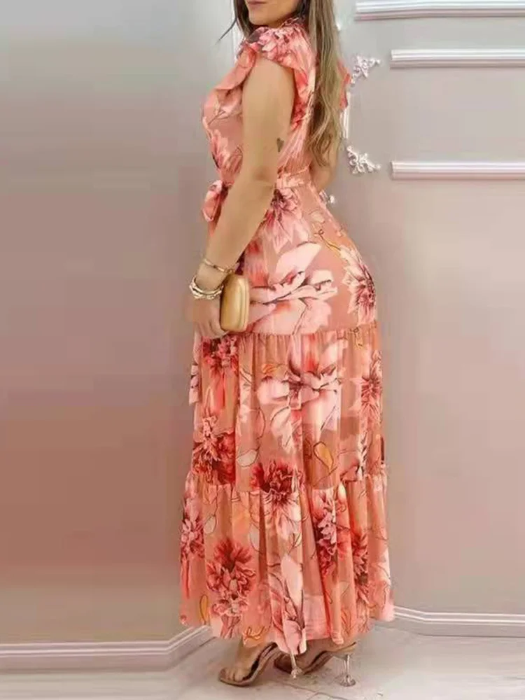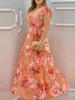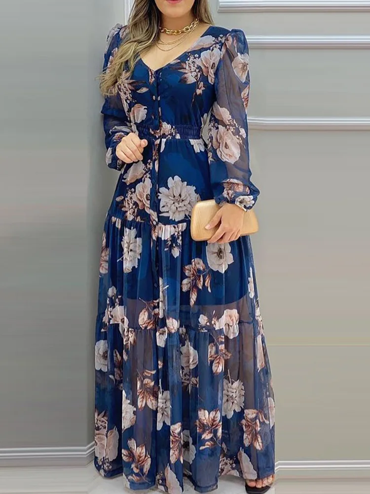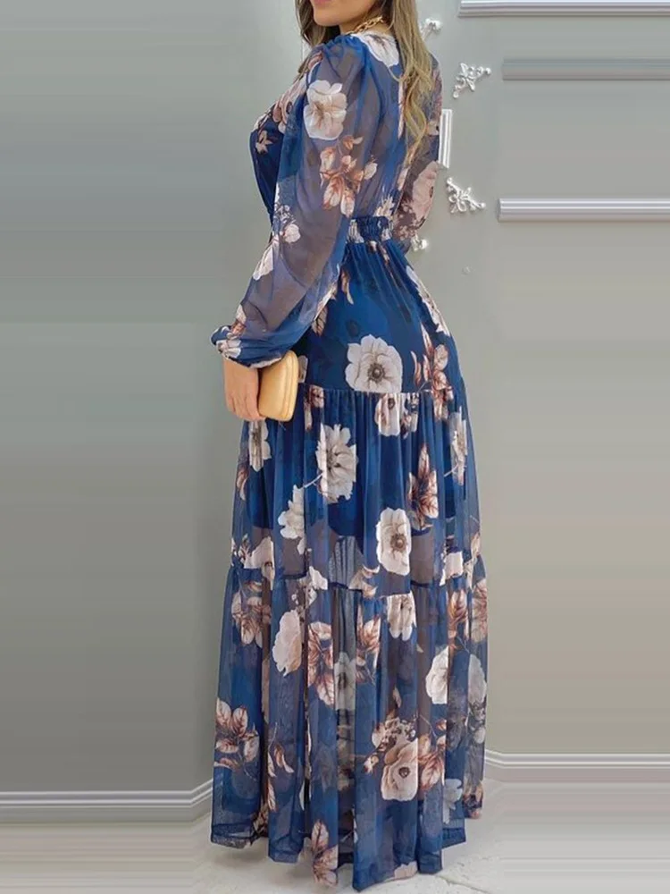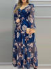 Floral Print Lantern Sleeve V-Neck Chiffon Dress Women Casual Maxi Dress