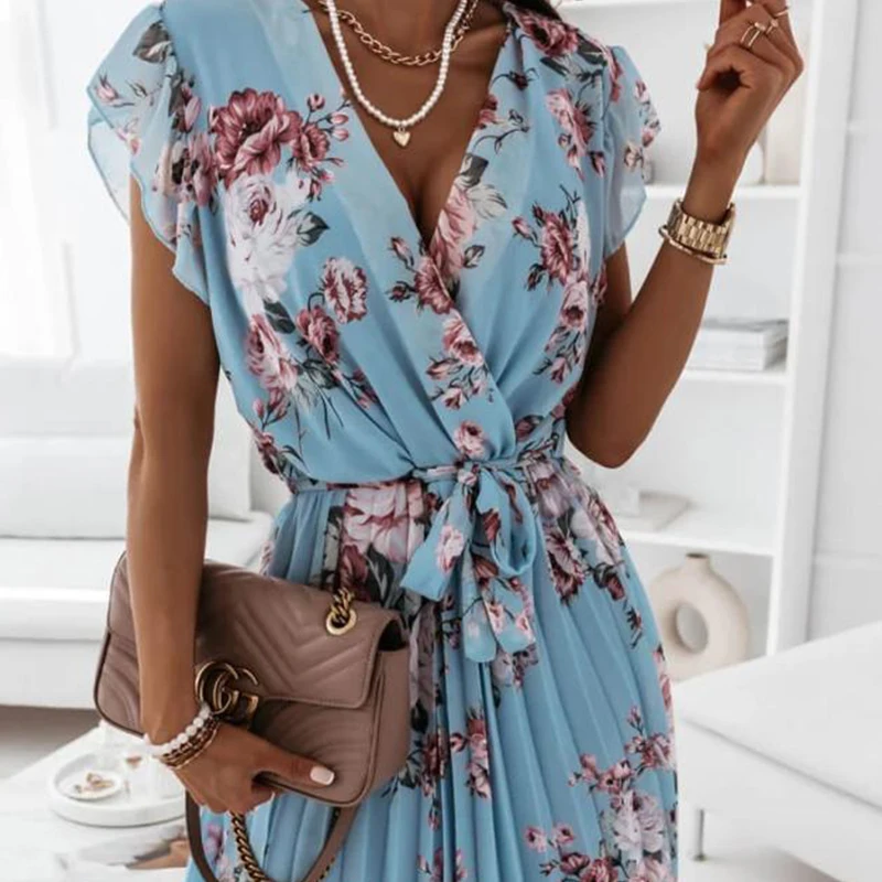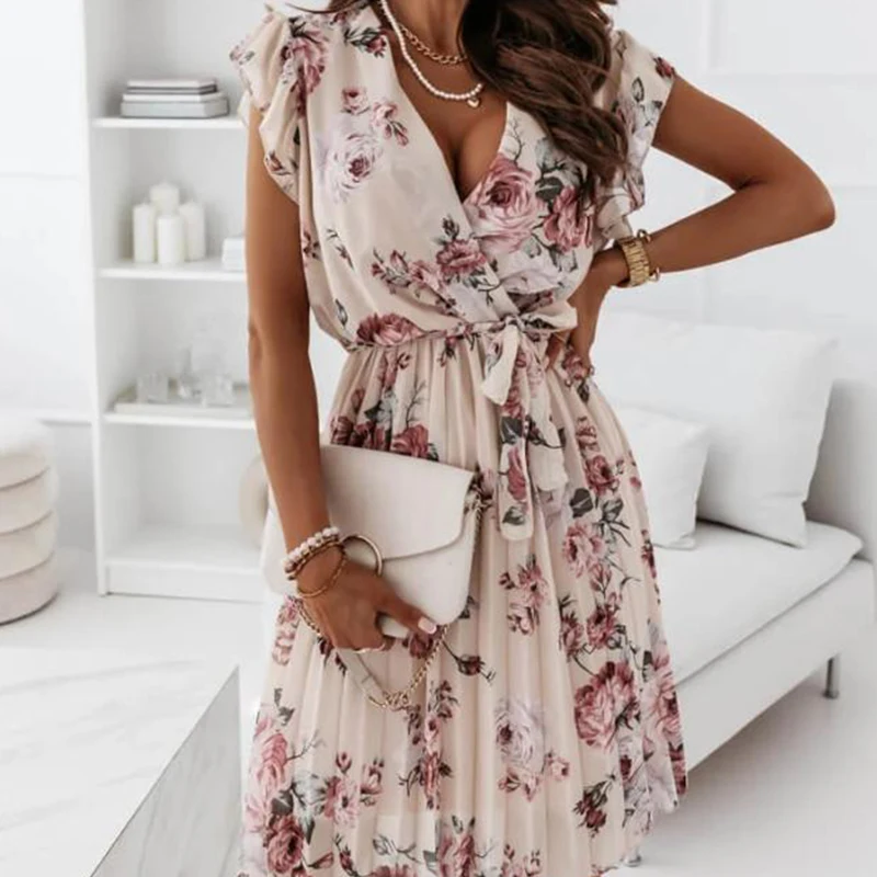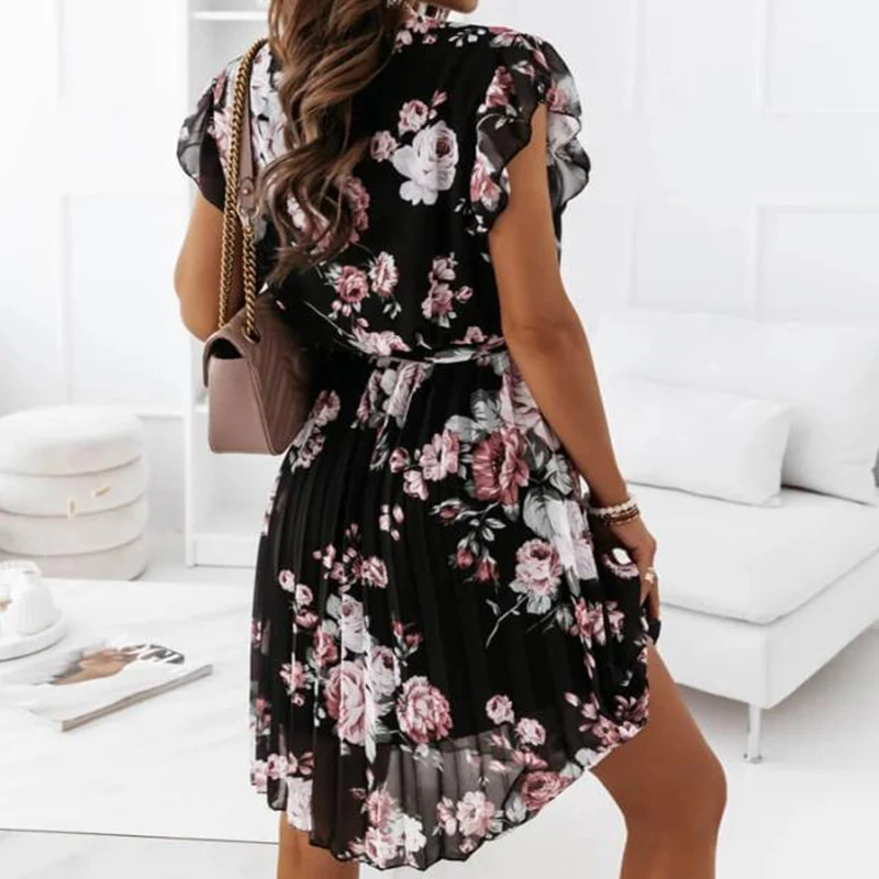 Floral Print Short Sleeve V Neck Ruffles Summer Dress Women